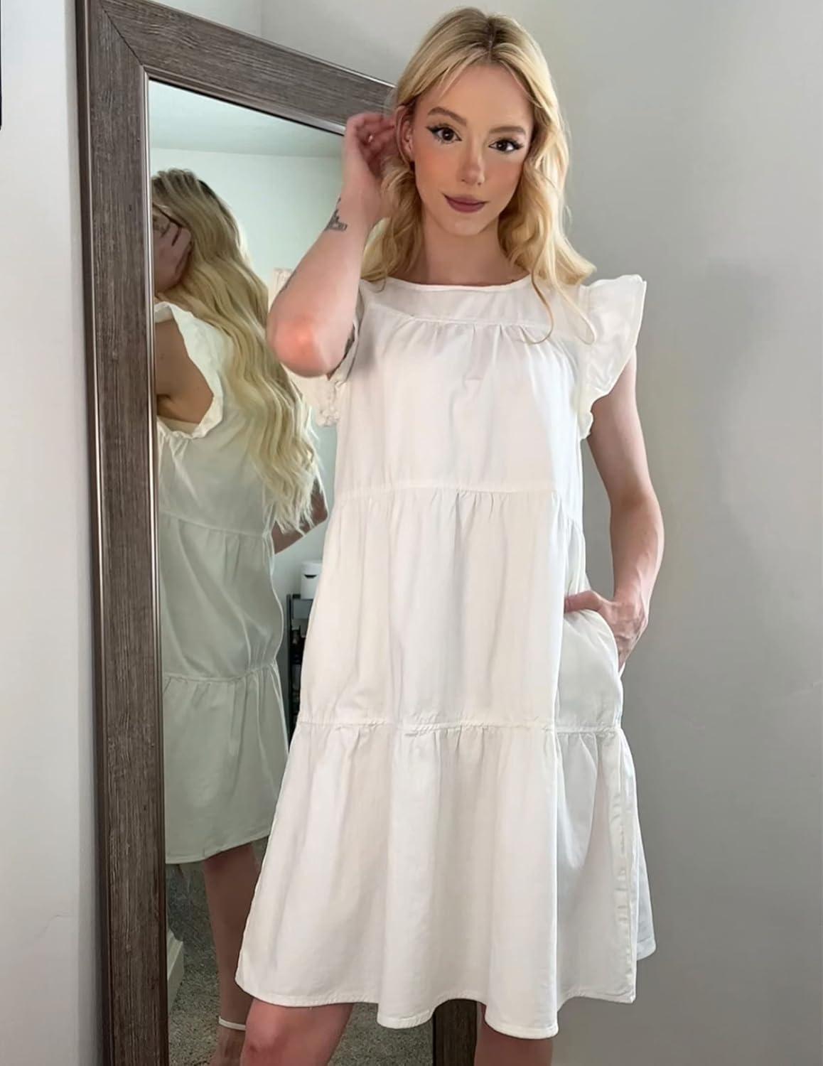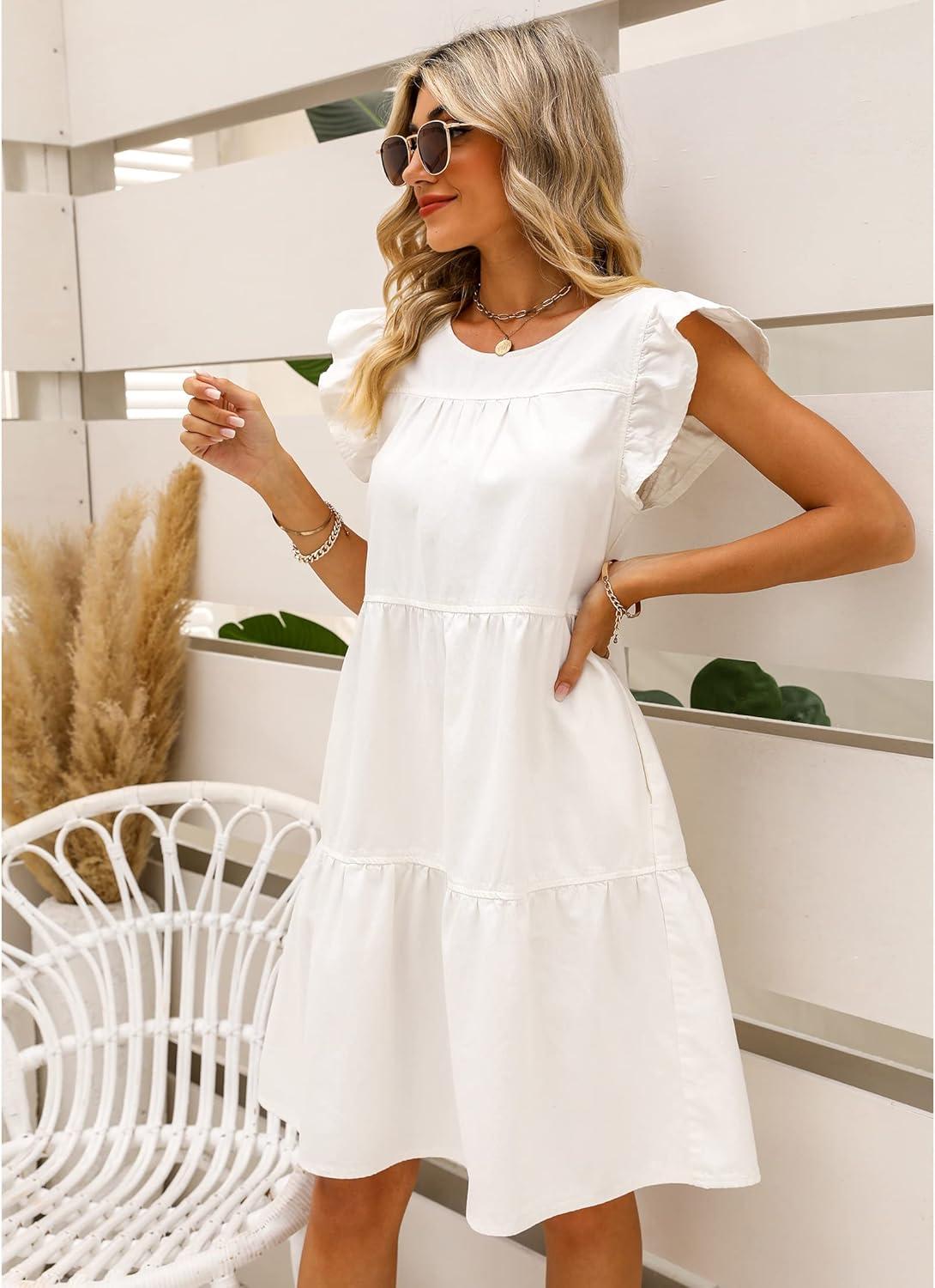 luvamia 2025 Denim Dress for Women Summer Babydoll Sleeveless Ruffle Sleeve Mini Dresses Loose Flowy Swing Pleated Dress(Brilliant White)