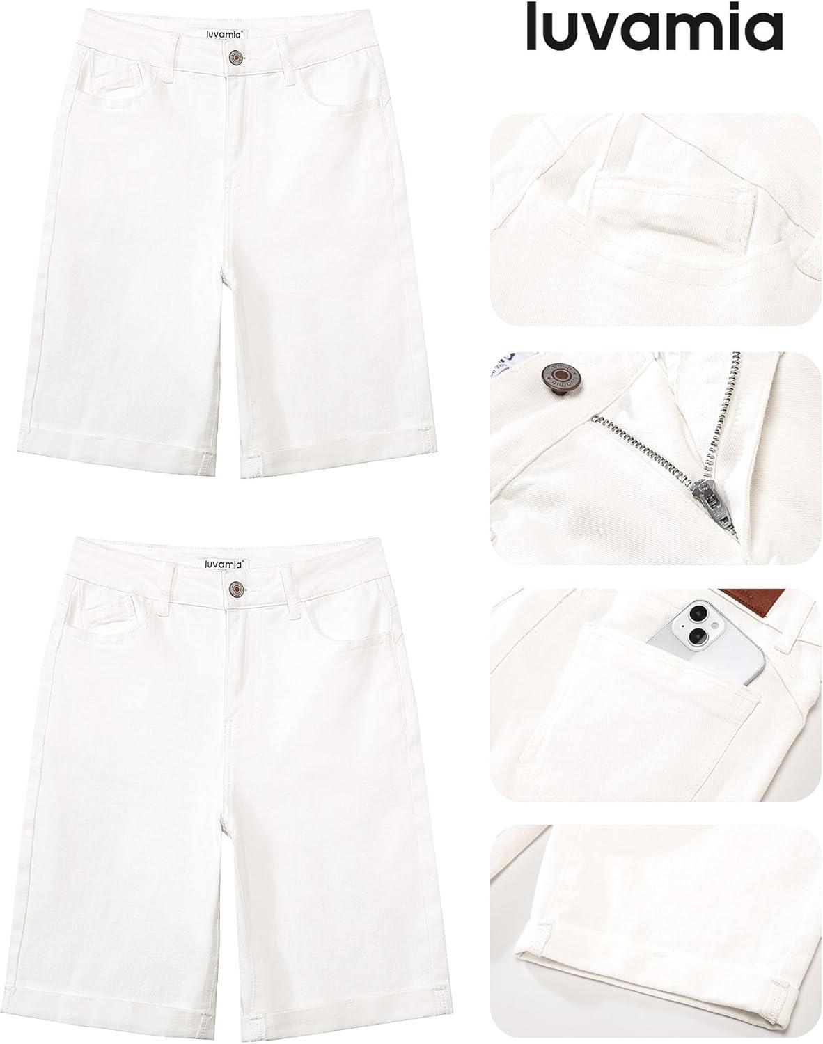 luvamia Bermuda Jean Shorts for Women Knee Length High Waisted Trendy Cuffed Hem Long Stretchy Denim Shorts Summer Jorts(Cream White)