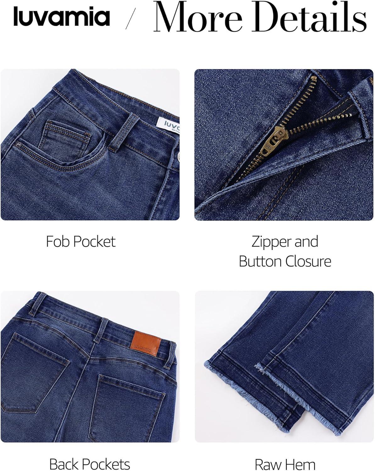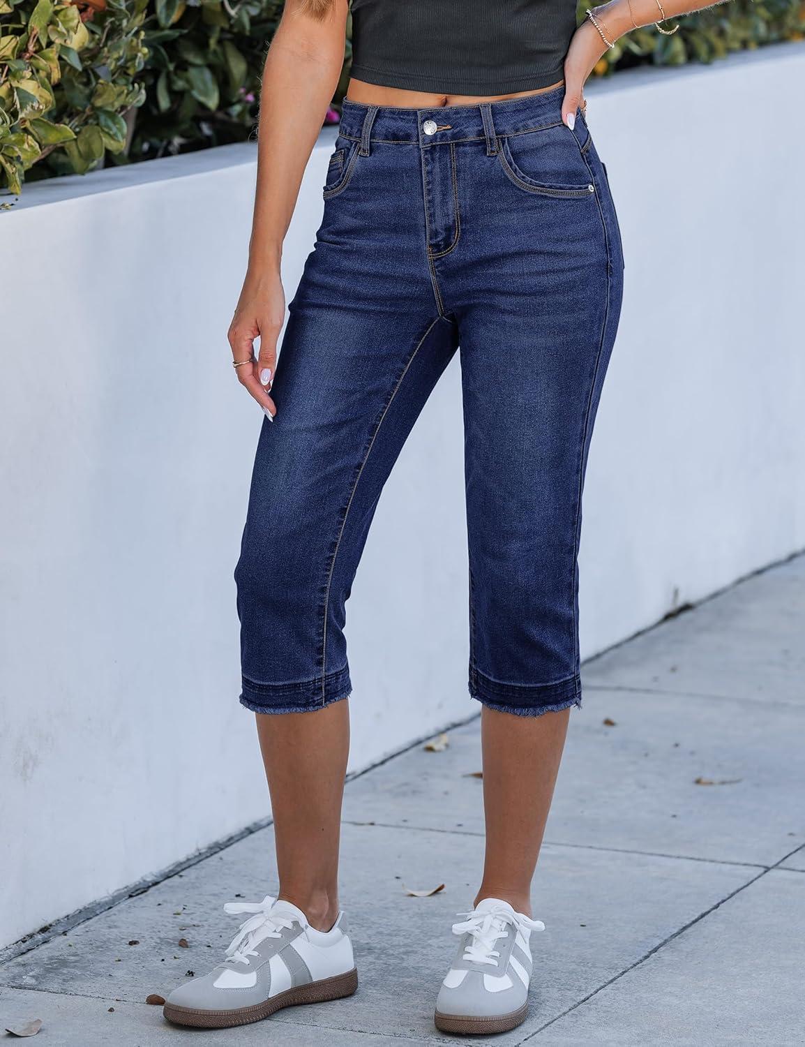 luvamia Capri Jeans for Women Trendy Mid Rise Distressed Raw Hem Casual Summer Stretchy Denim Capris Pants Relaxed Fit(Darkness Blue)