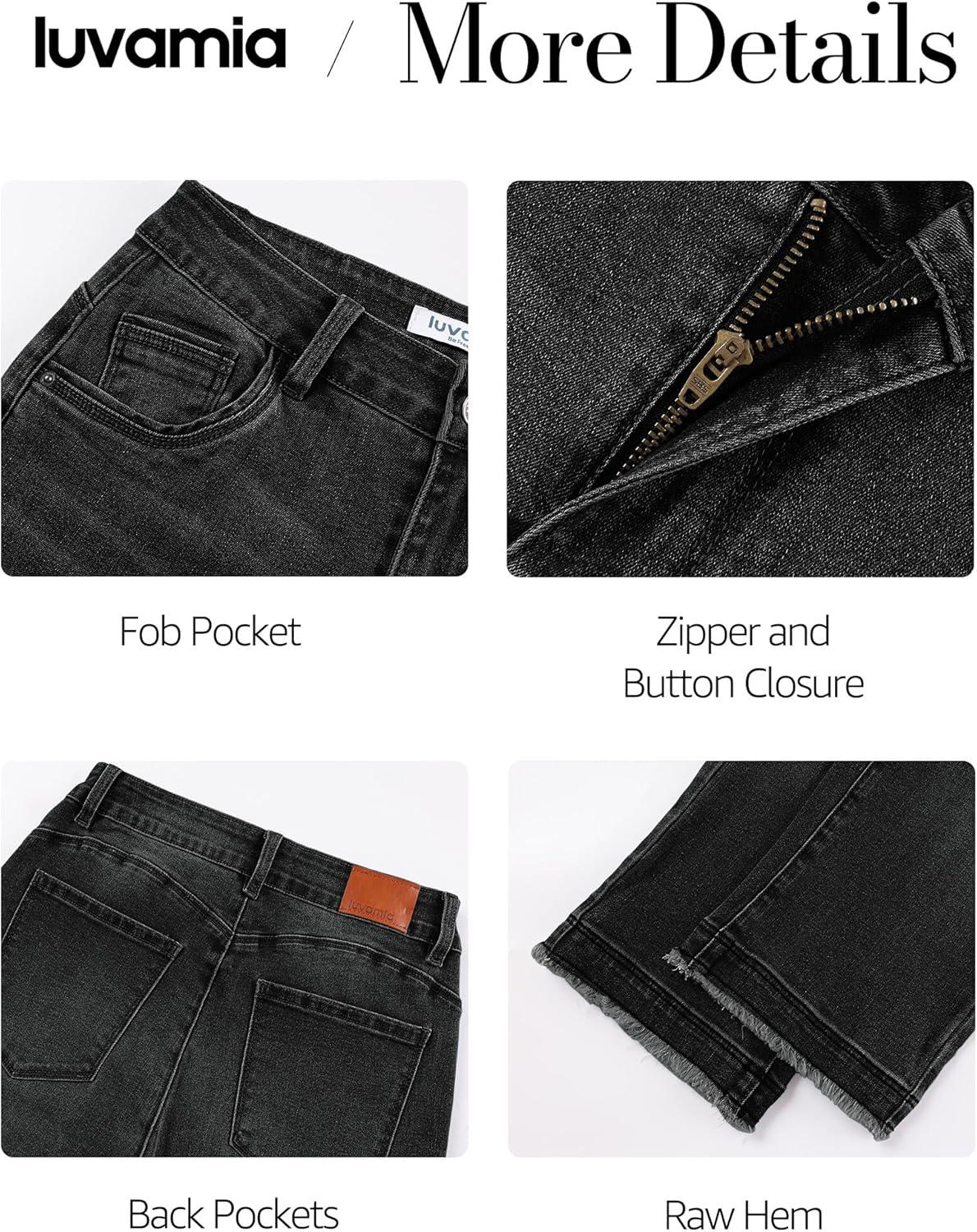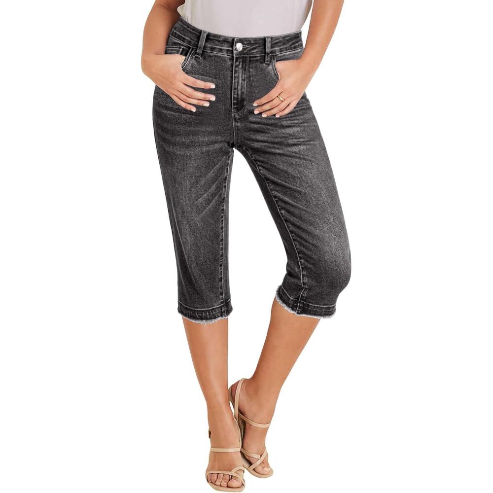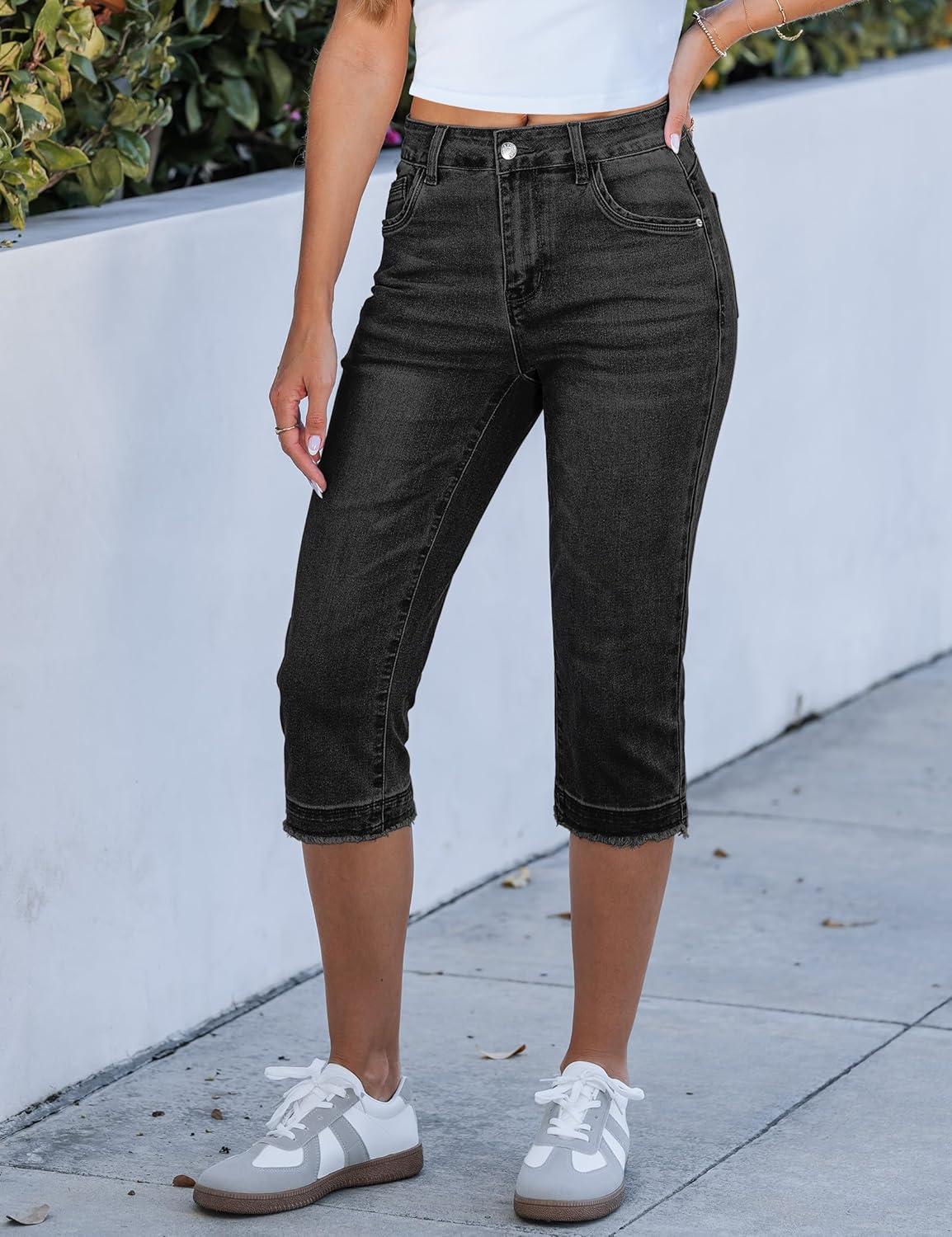 luvamia Capri Jeans for Women Trendy Mid Rise Distressed Raw Hem Casual Summer Stretchy Denim Capris Pants Relaxed Fit(Washed Black)