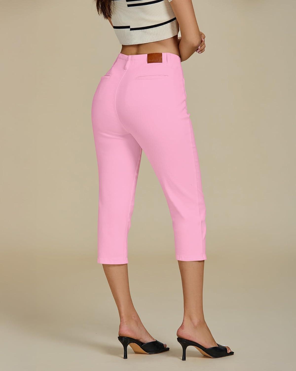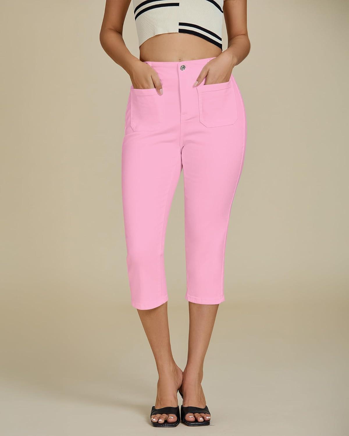 luvamia Capris Jeans for Women Trendy High Waisted Patch Pocket Casual Summer Cropped Stretchy Denim Skinny Capri Pants(Pink)