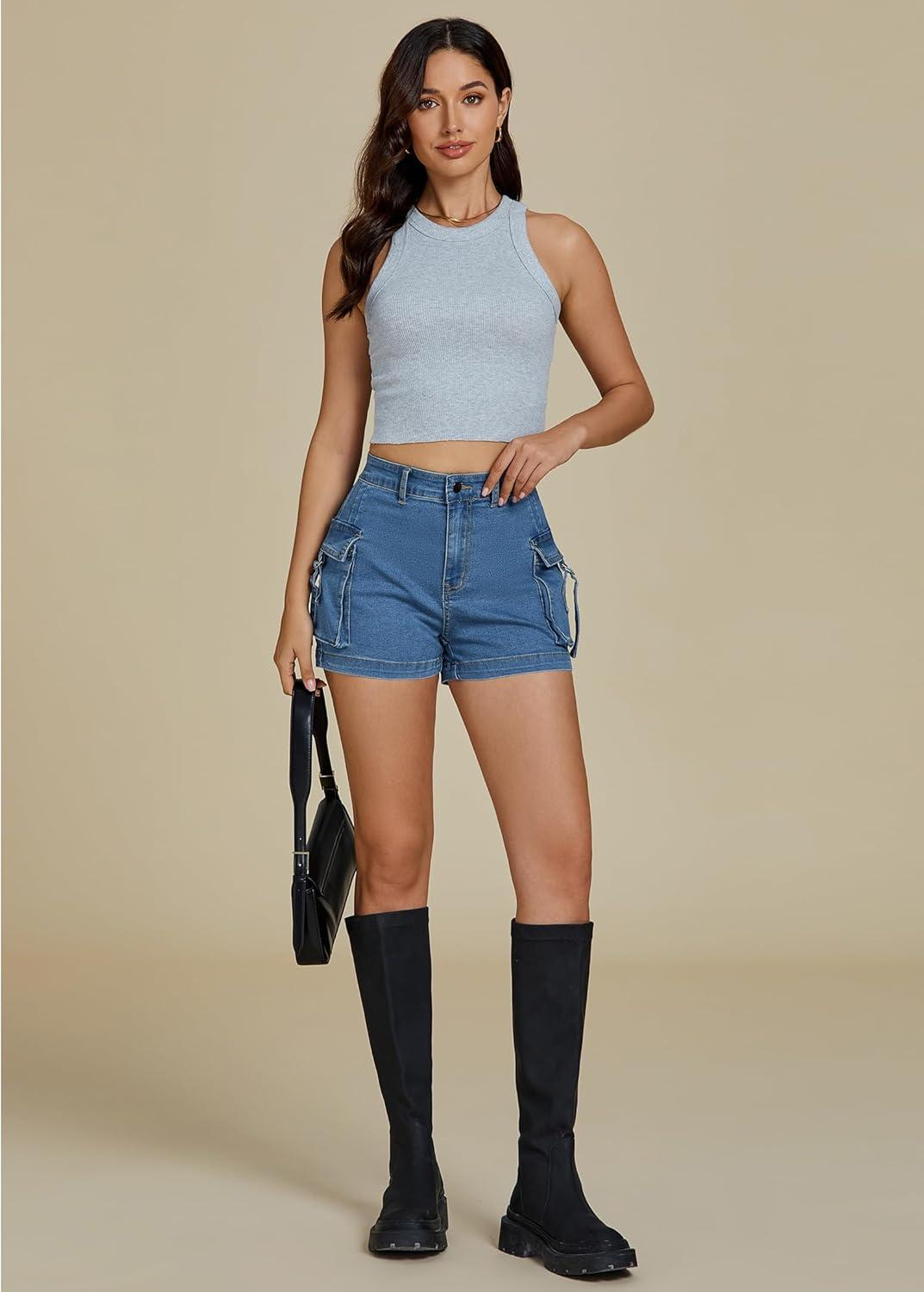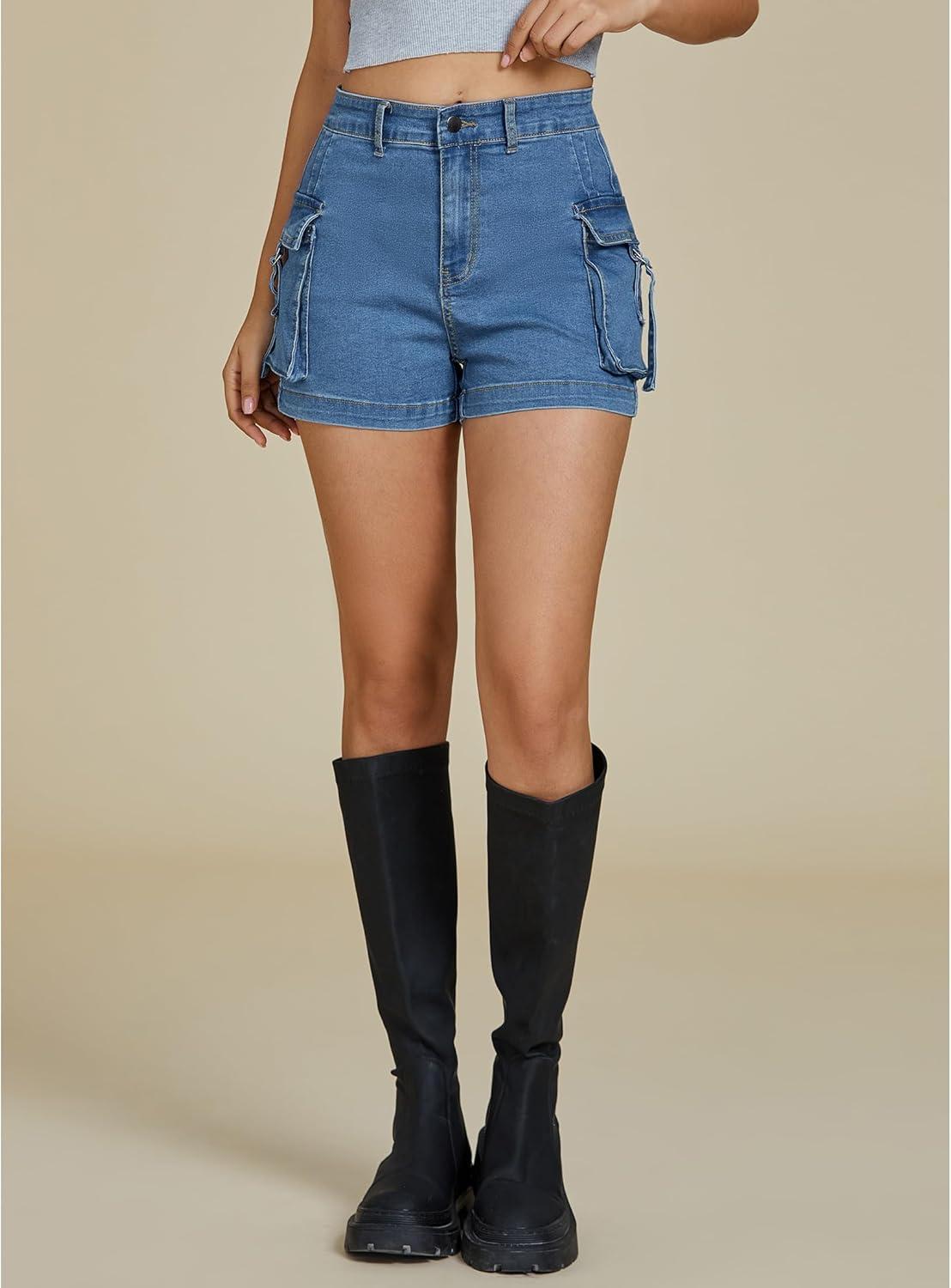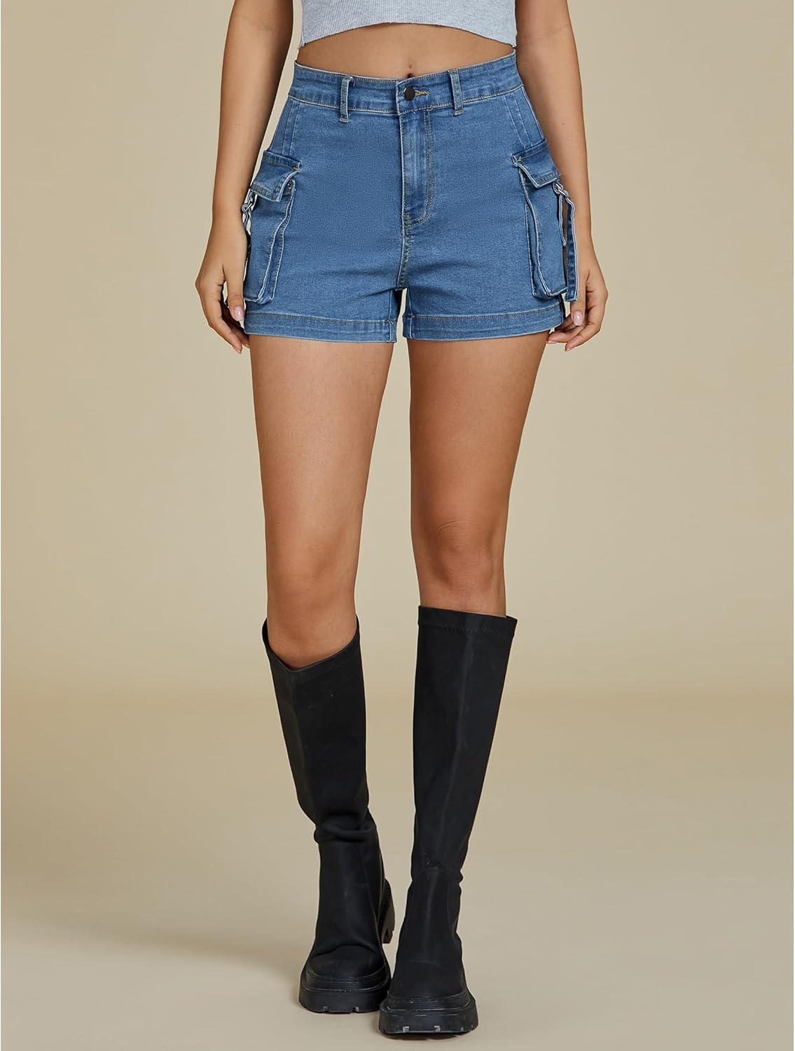 luvamia Cargo Shorts for Women Trendy High Wasited Casual Summer Stretchy Utility Cut Off Shorts with Pockets(Medium Blue)