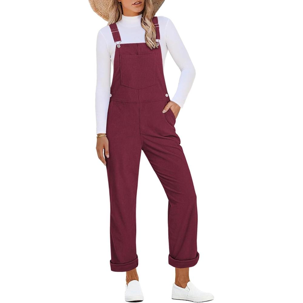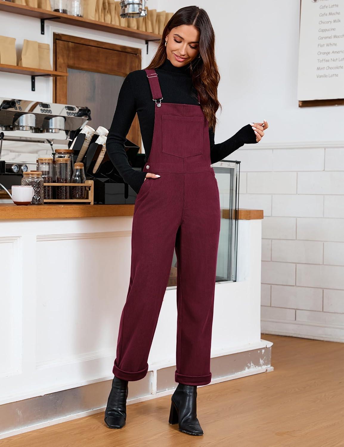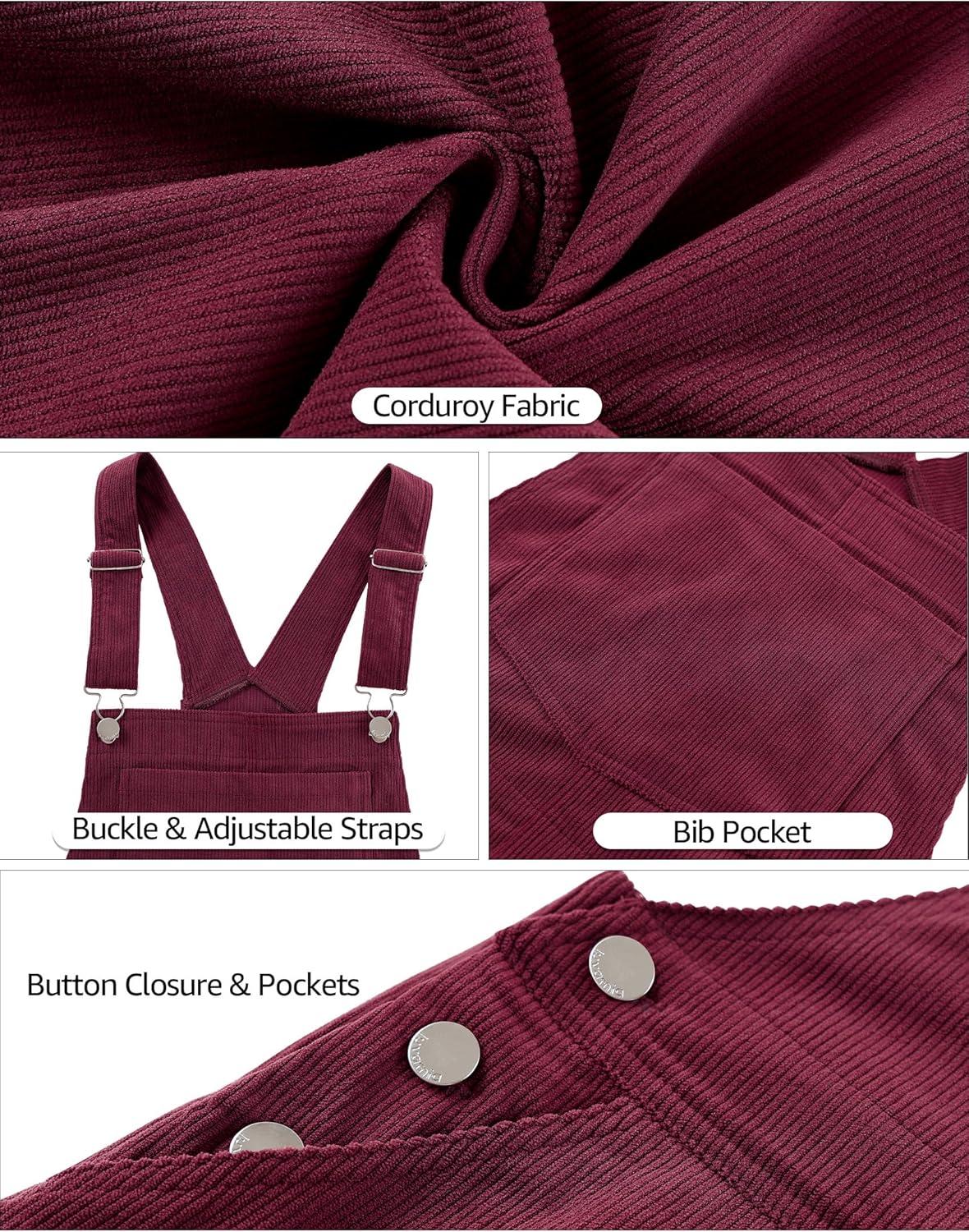 luvamia Corduroy Overalls for Women Loose Fit Baggy Straight Casual Adjustable Straps Bib Jumpsuit Overalls with Pockets(Wine Red)