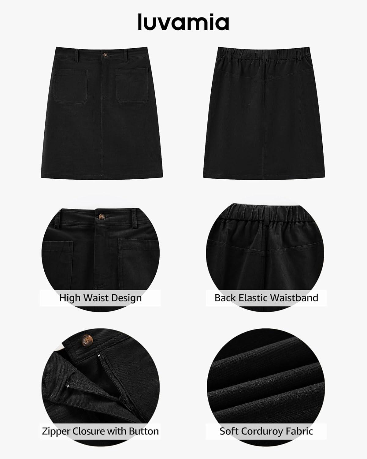 luvamia Corduroy Skirts for Women High Waisted Trendy Fall Elastic Waist Casual Stretchy Short Skirts with Patch Pockets(Black)