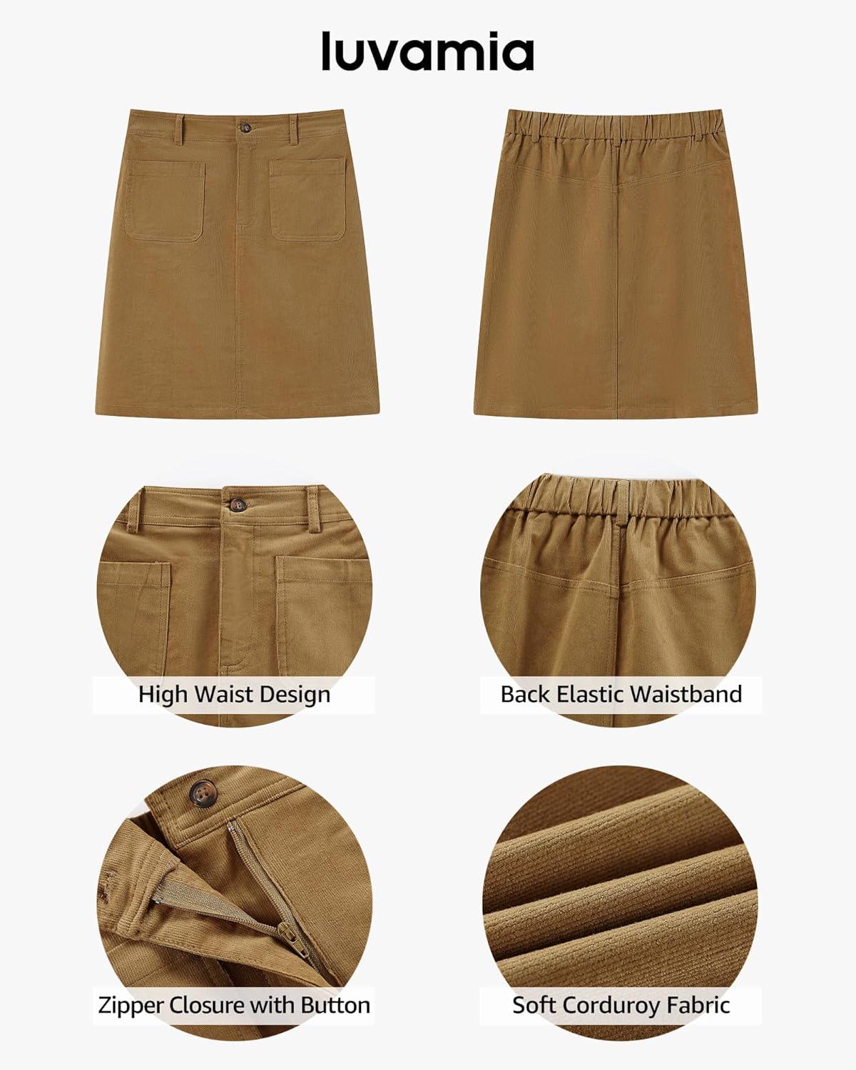 luvamia Corduroy Skirts for Women High Waisted Trendy Fall Elastic Waist Casual Stretchy Short Skirts with Patch Pockets(Toffee Brown)