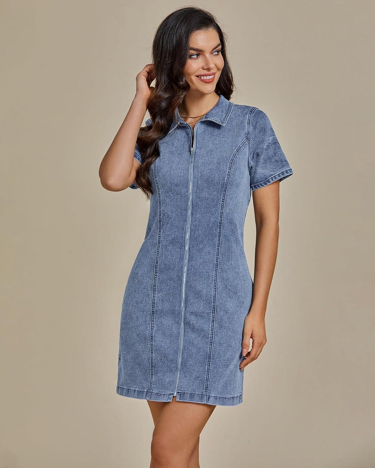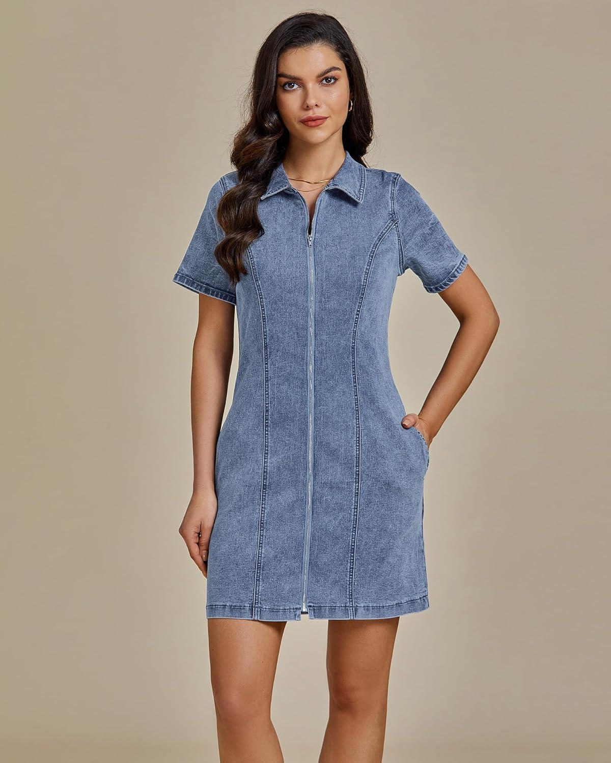 luvamia Denim Dresses for Women Summer Casual Zip Up Short Sleeve Western Short Stretchy Jean Dress with Pockets(Bay Blue)