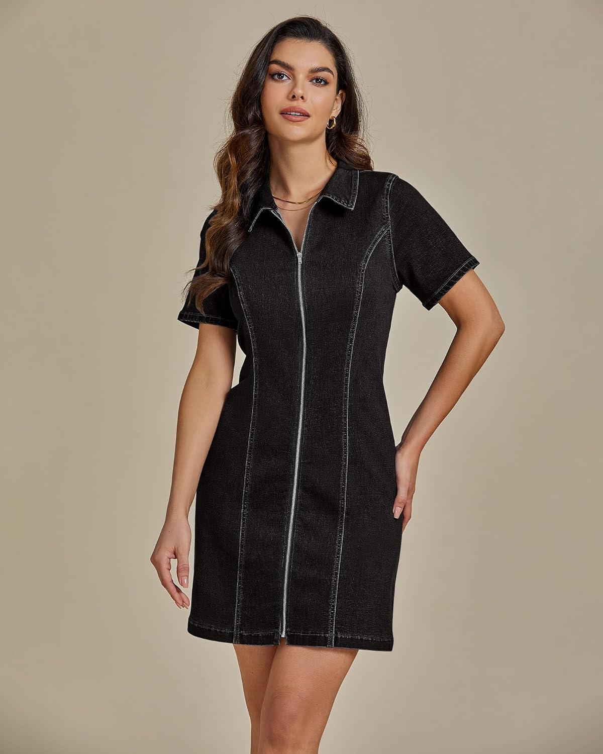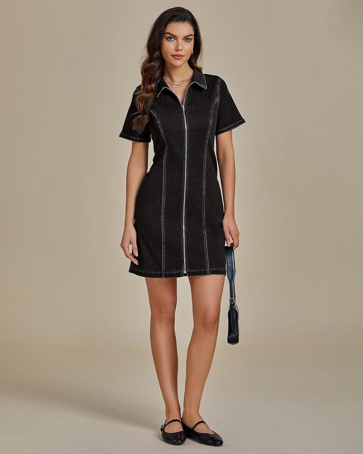 luvamia Denim Dresses for Women Summer Casual Zip Up Short Sleeve Western Short Stretchy Jean Dress with Pockets(Washed Black)