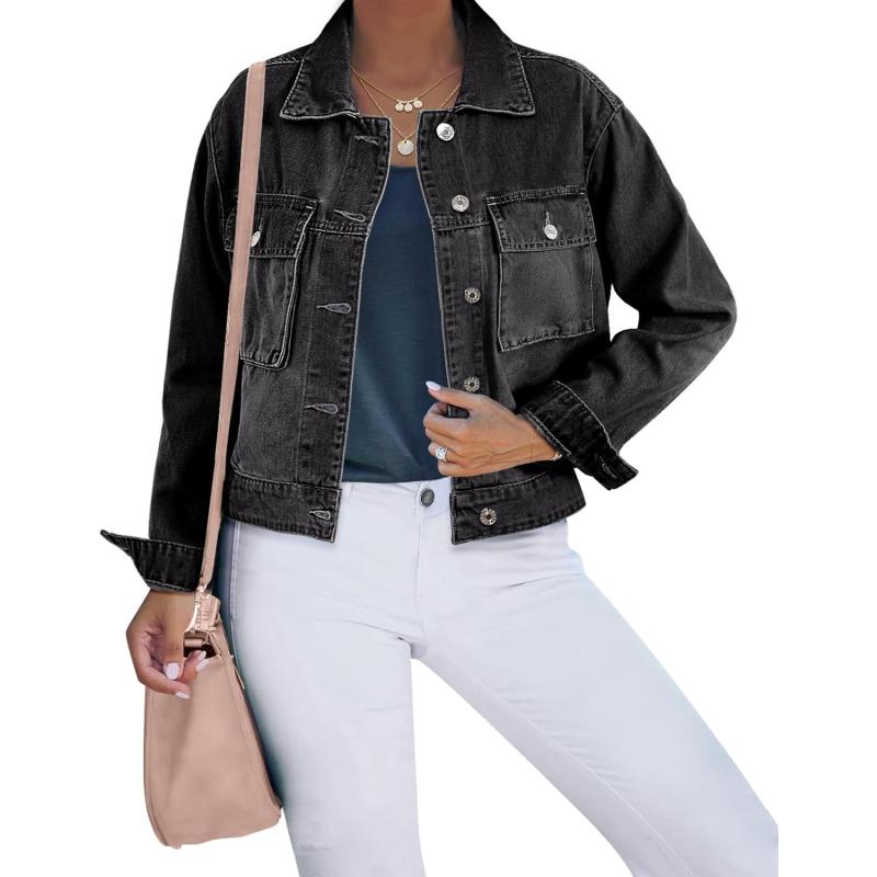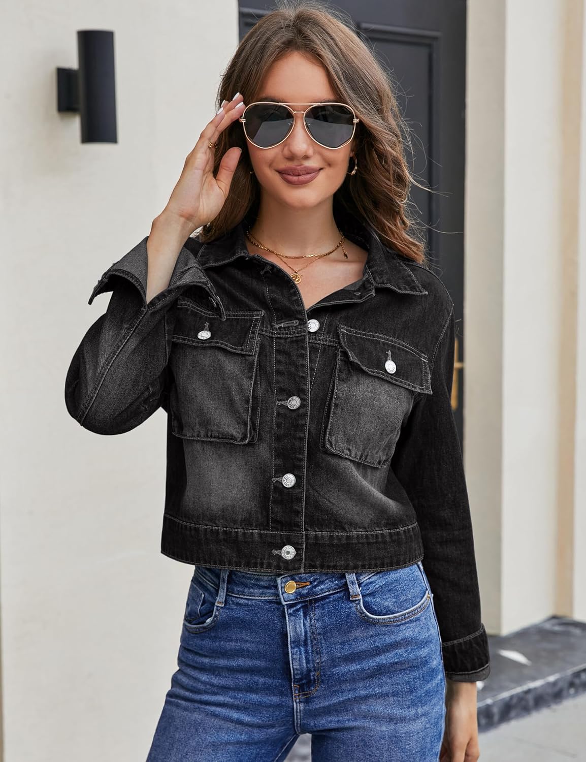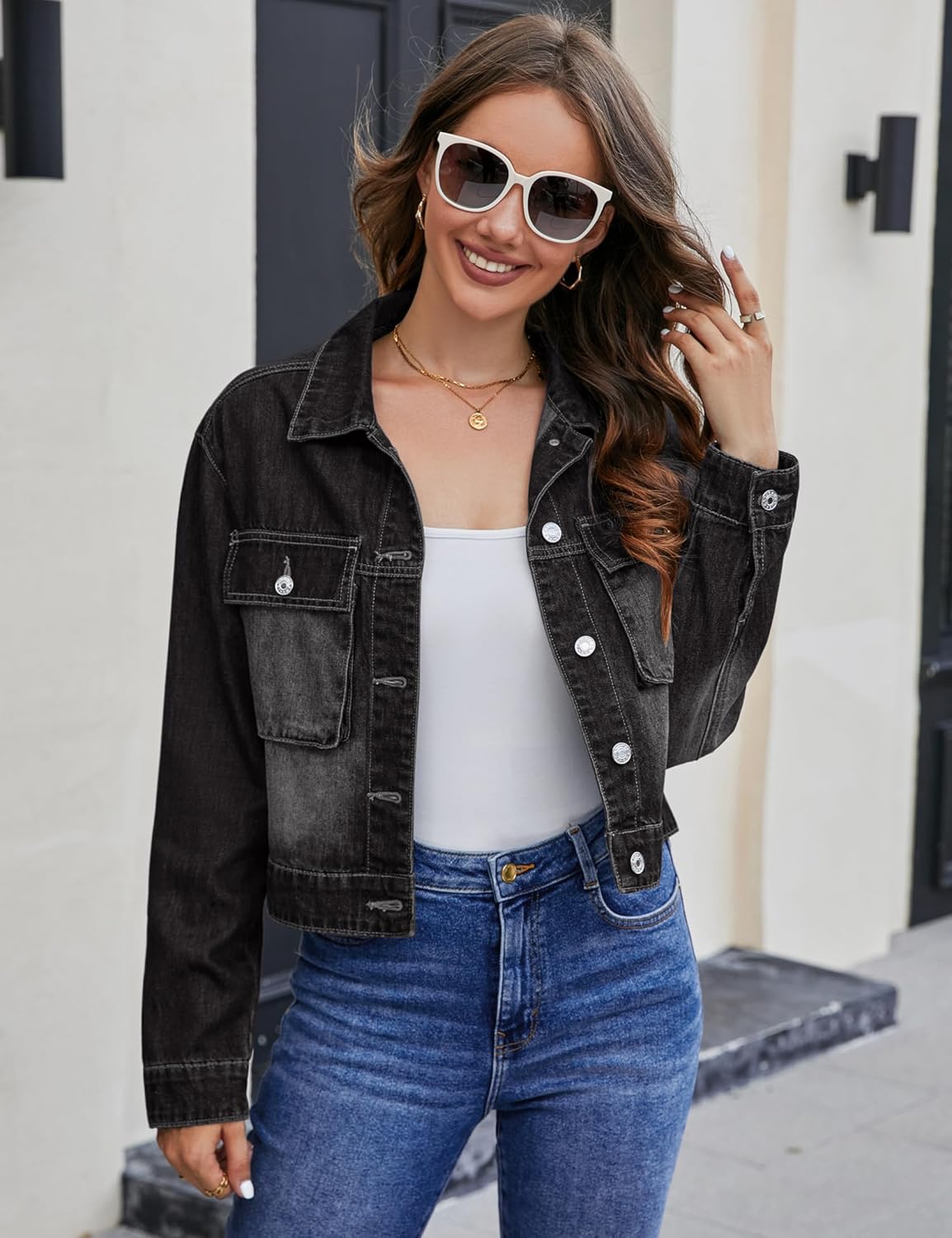 luvamia Denim Jacket for Women Cargo Pocket Lightweight Cropped Jean Jackets Oversized Trucker Shacket Trendy FashionWashed Black