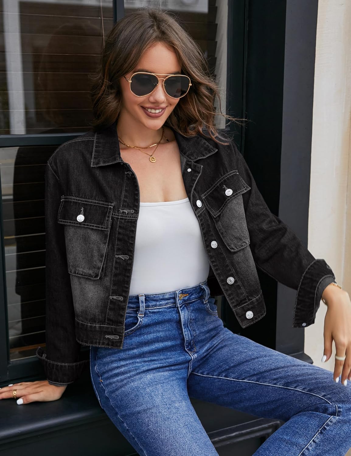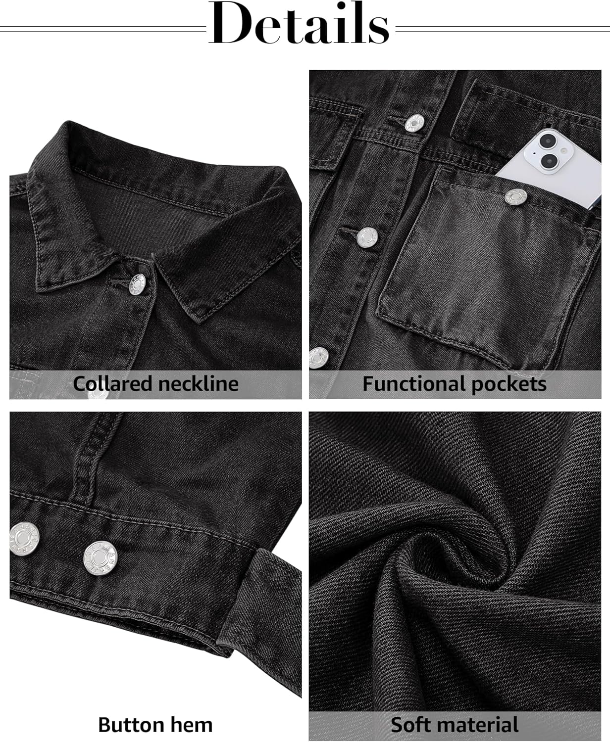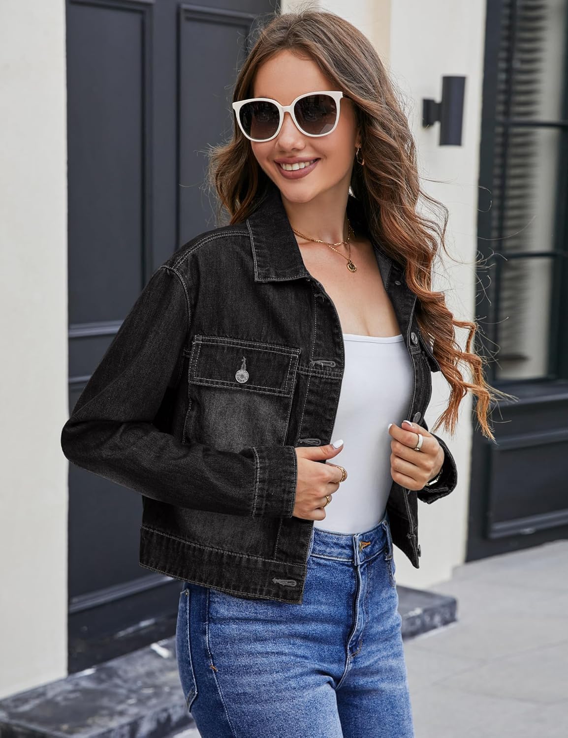 luvamia Denim Jacket for Women Cargo Pocket Lightweight Cropped Jean Jackets Oversized Trucker Shacket Trendy FashionWashed Black