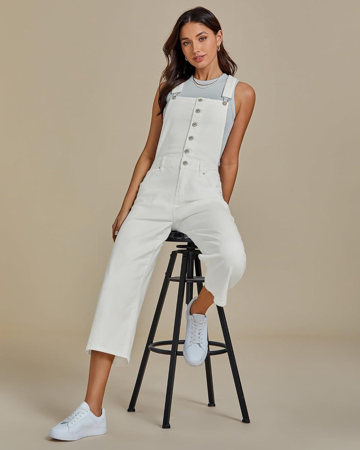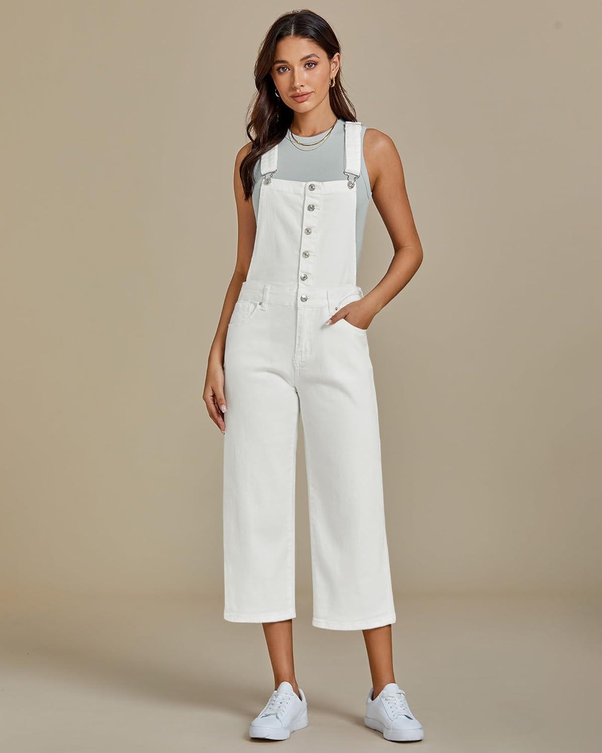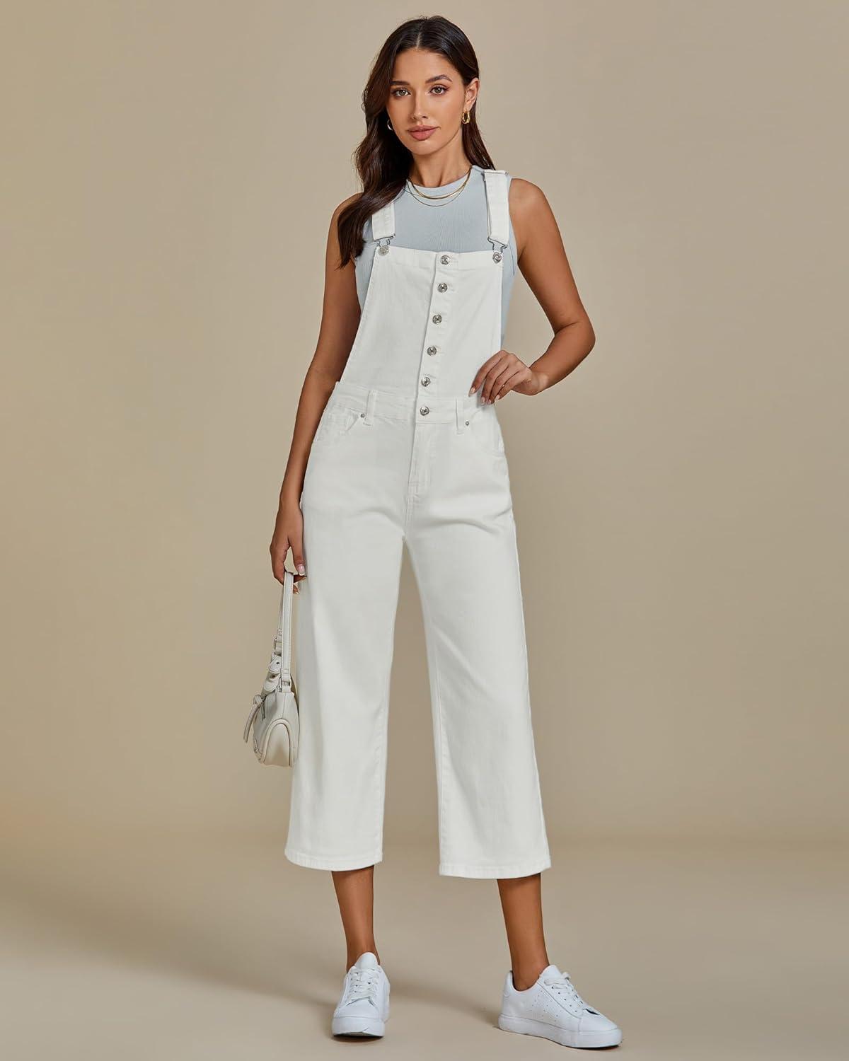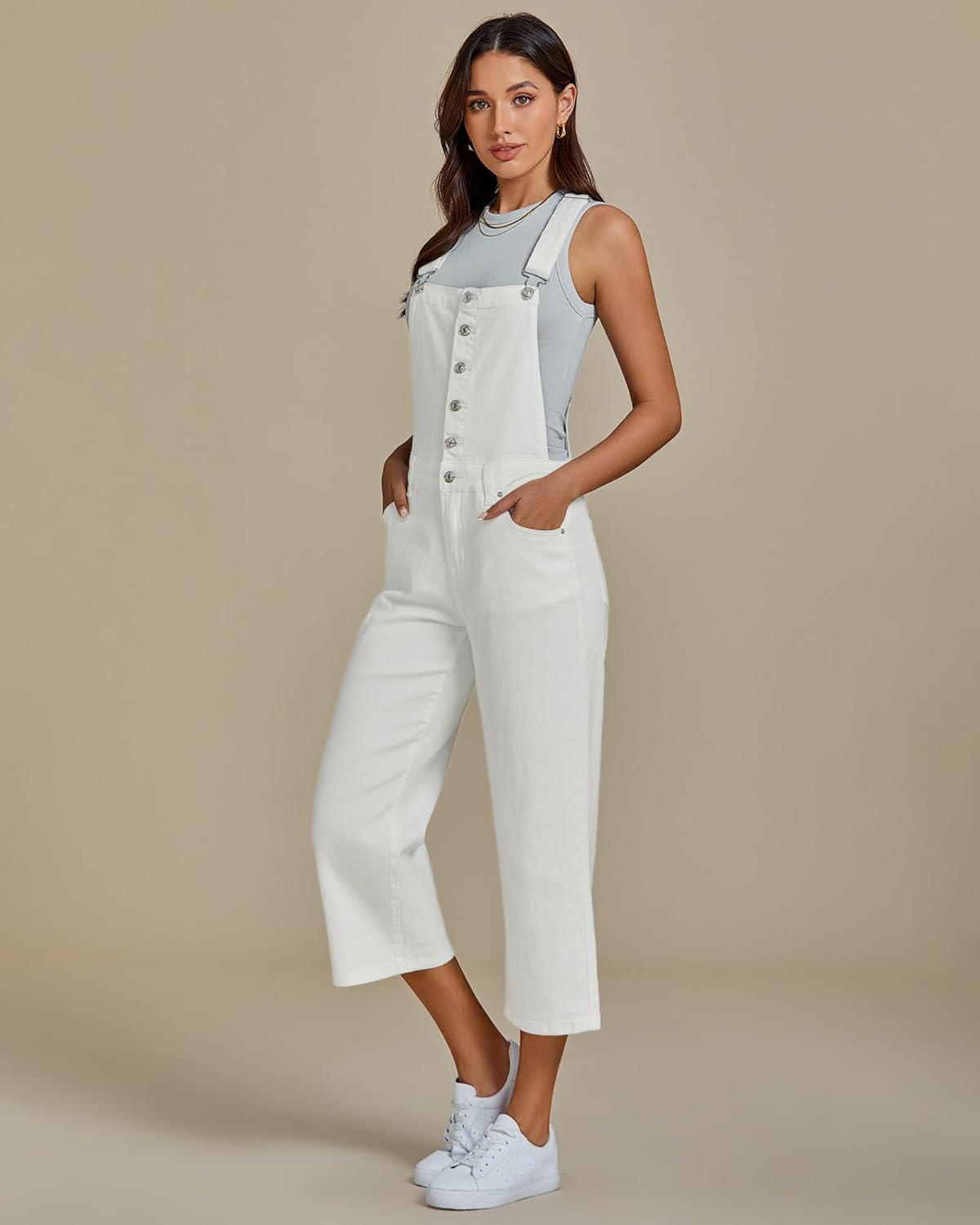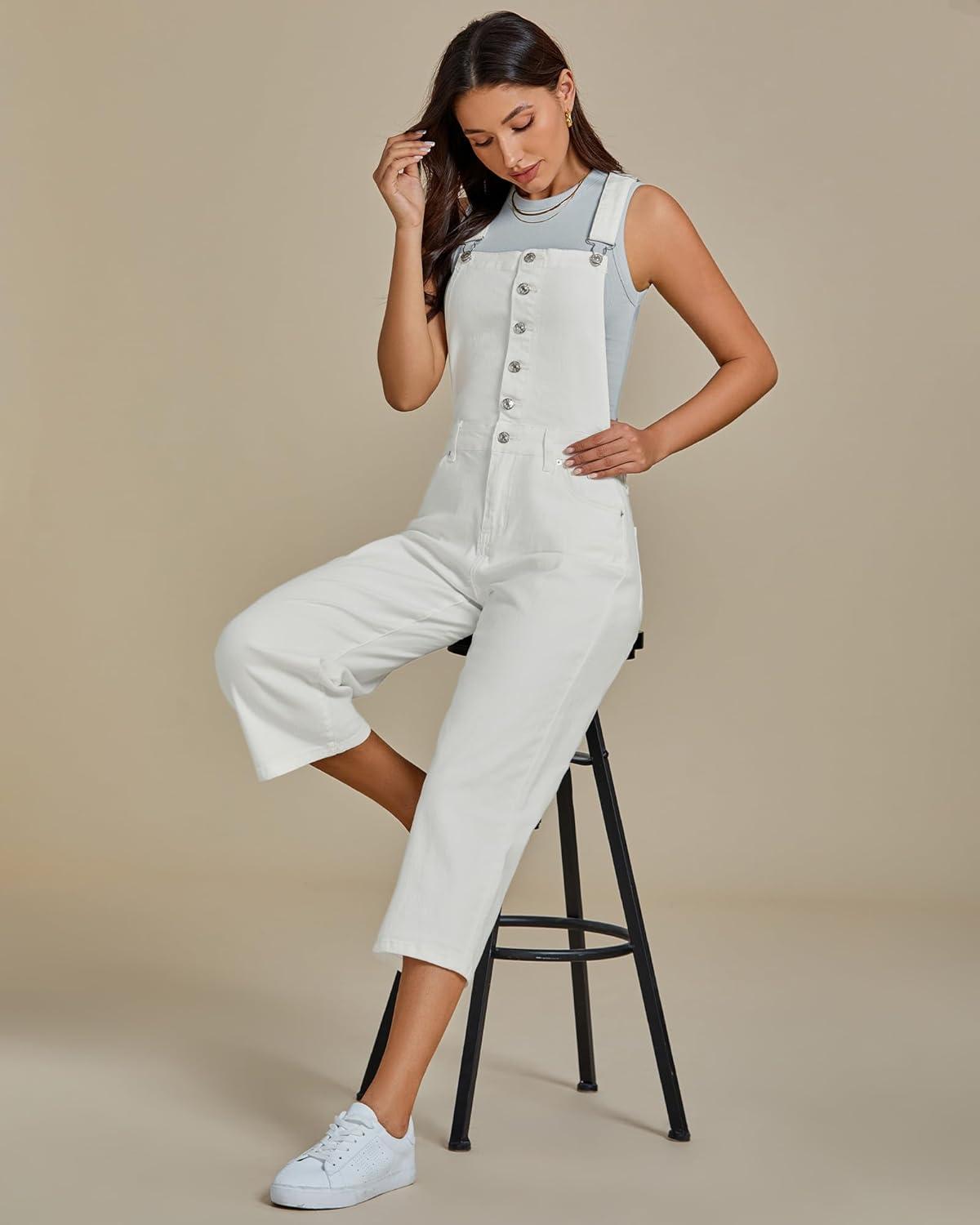 imageluvamia Denim Overalls for Women Stretchy Capri Jean Jumpsuit Loose Fit Summer Cropped Wide Leg Button Front Bib OverallCream White