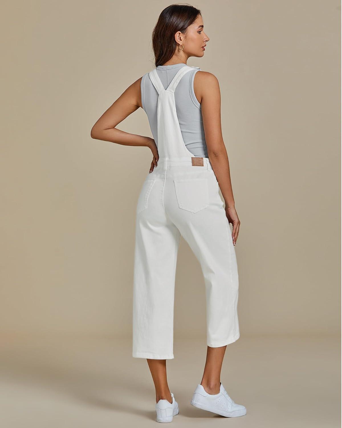 luvamia Denim Overalls for Women Stretchy Capri Jean Jumpsuit Loose Fit Summer Cropped Wide Leg Button Front Bib Overall(Cream White)