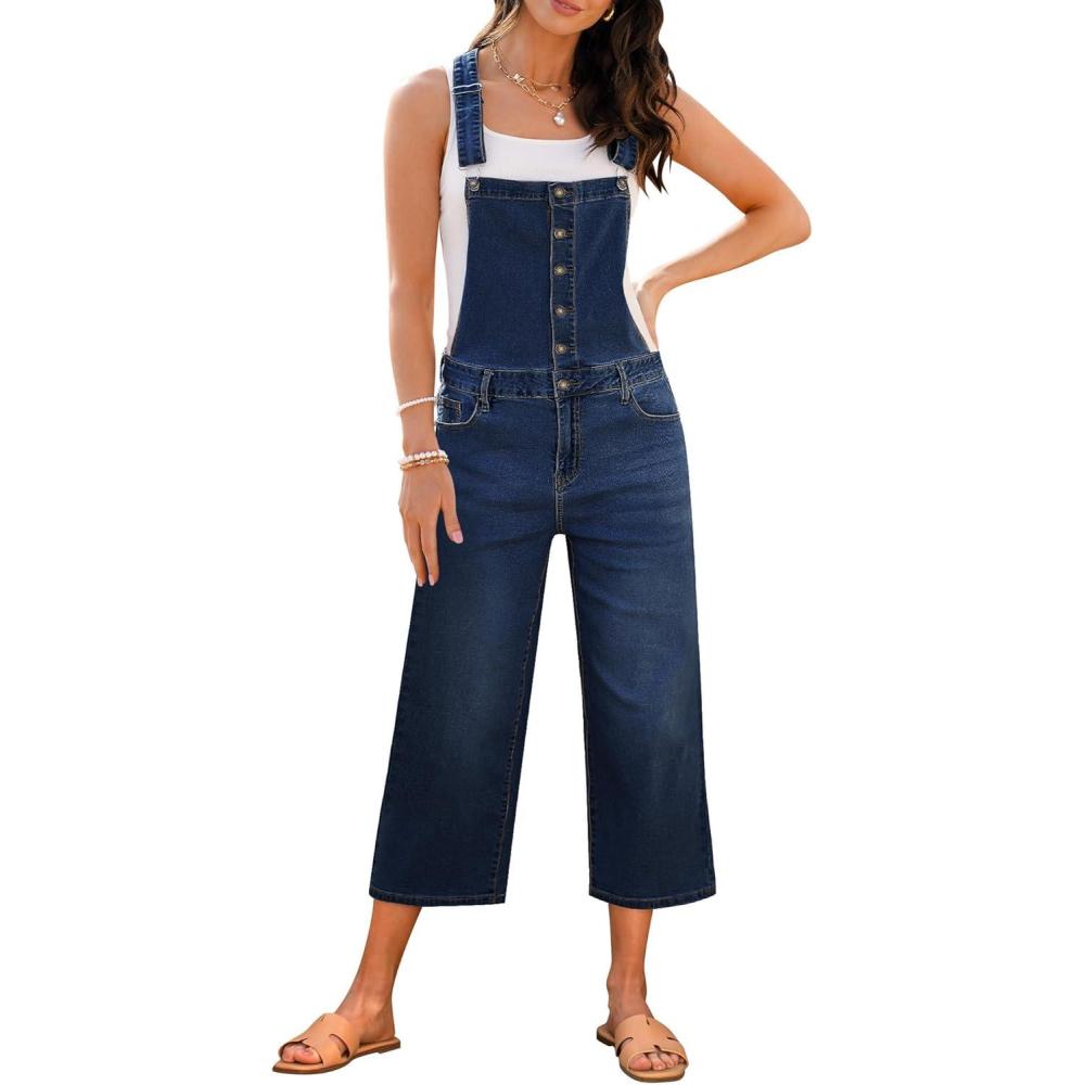 imageluvamia Denim Overalls for Women Stretchy Capri Jean Jumpsuit Loose Fit Summer Cropped Wide Leg Button Front Bib OverallDarkness Blue