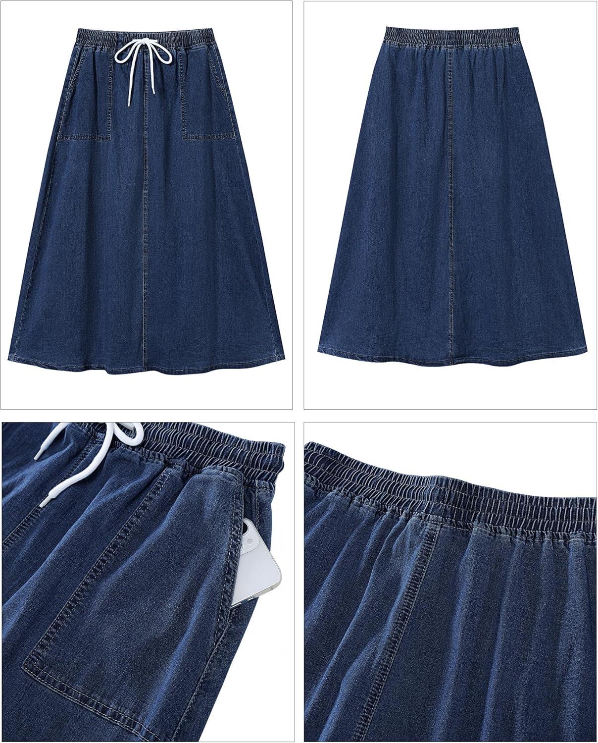 luvamia Denim Skirts for Women Trendy A Line Long Maxi Pull On Elastic Waist Drawstring Stretchy Jean Skirt with Pockets(Medium Blue)