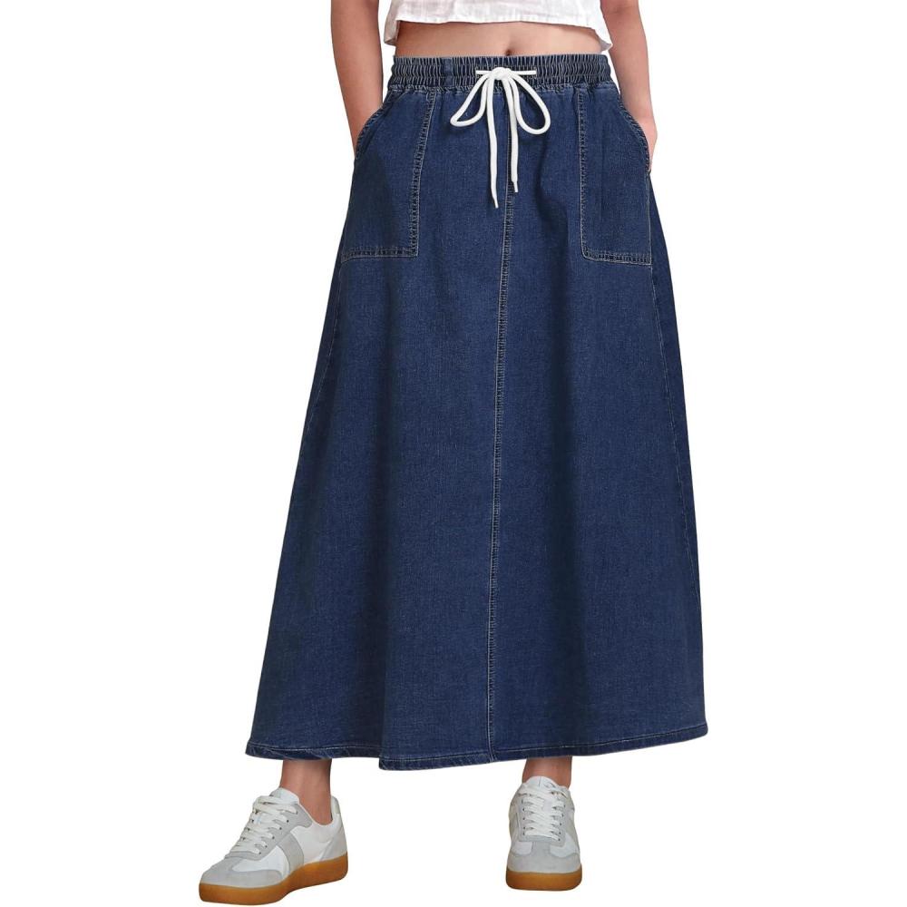 luvamia Denim Skirts for Women Trendy A Line Long Maxi Pull On Elastic Waist Drawstring Stretchy Jean Skirt with Pockets(Dark Blue)