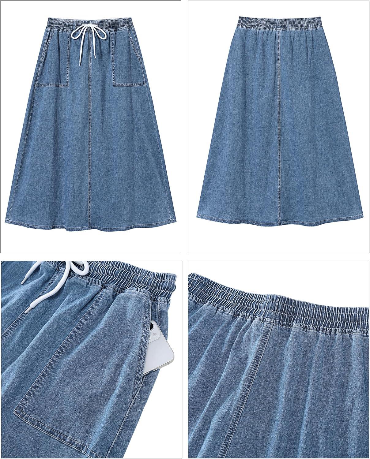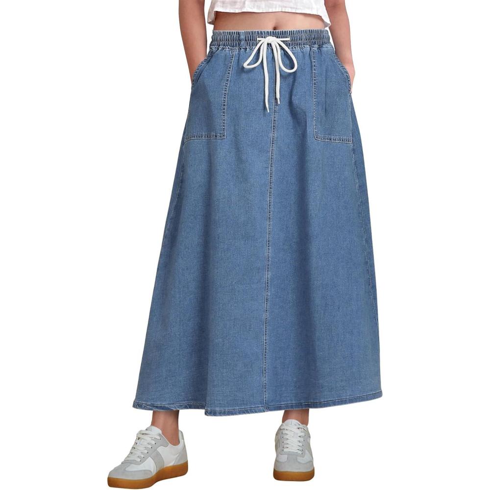 luvamia Denim Skirts for Women Trendy A Line Long Maxi Pull On Elastic Waist Drawstring Stretchy Jean Skirt with Pockets(Medium Blue)