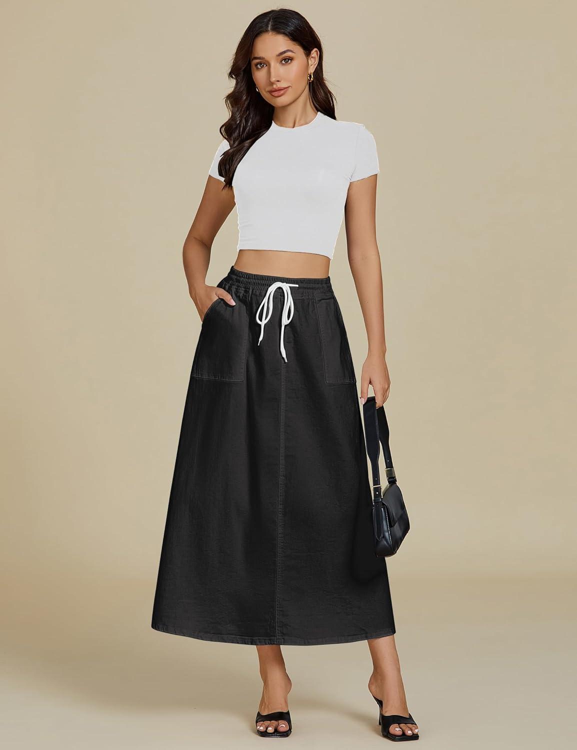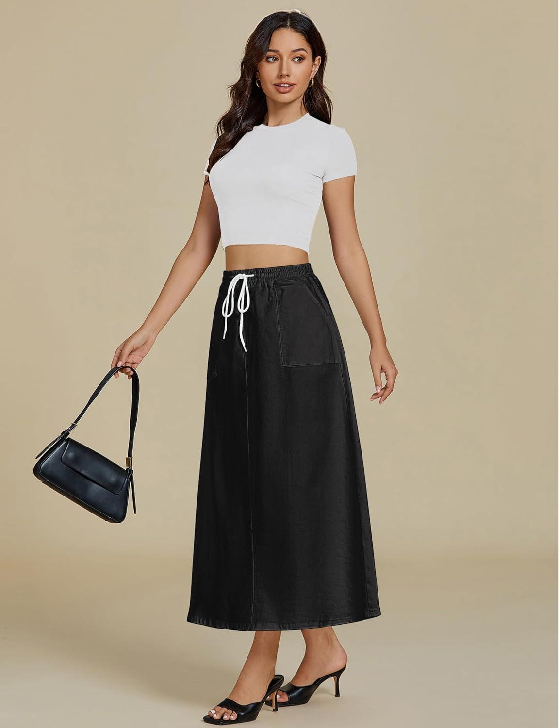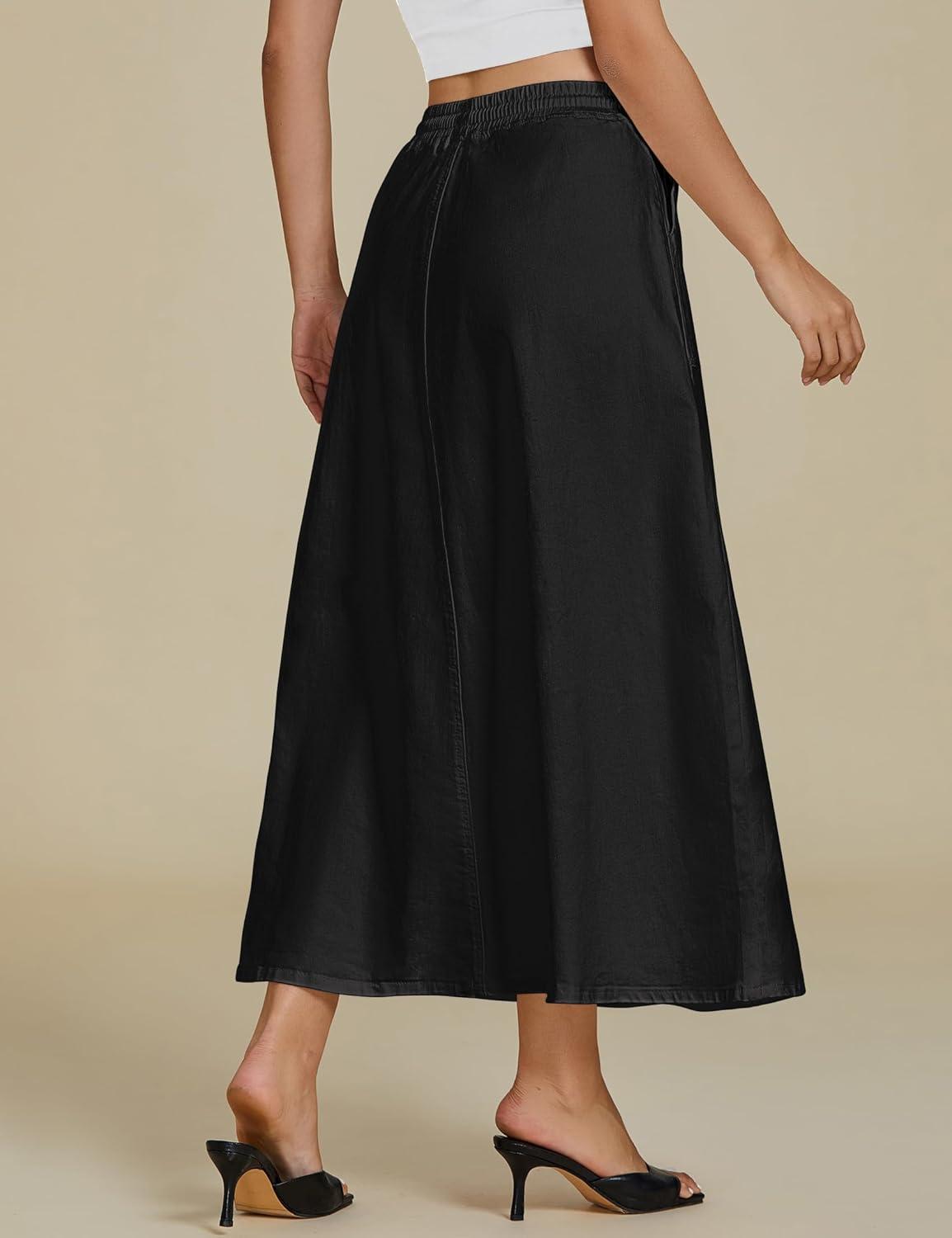 luvamia Denim Skirts for Women Trendy A Line Long Maxi Pull On Elastic Waist Drawstring Stretchy Jean Skirt with Pockets(True Black)