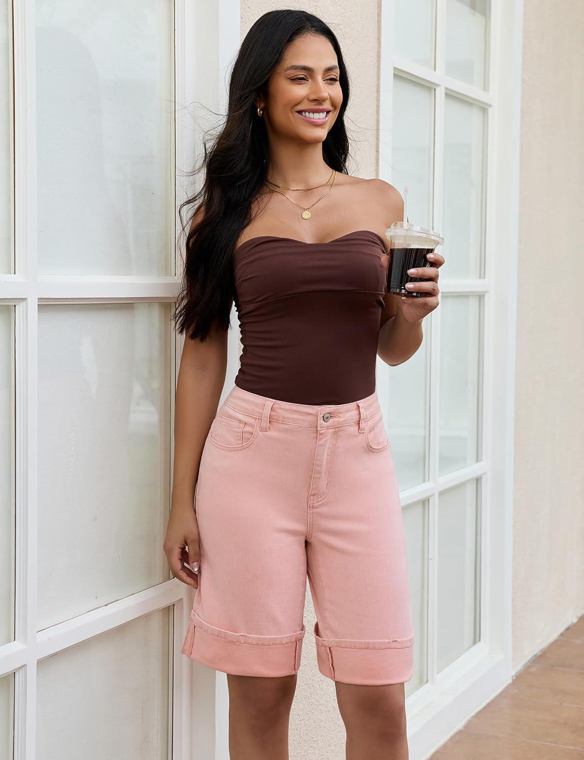 imageluvamia Jean Bermuda Shorts for Women High Waisted Knee Length Cuffed Long Stretchy Denim Shorts Loose Summer JortsCandy Pink