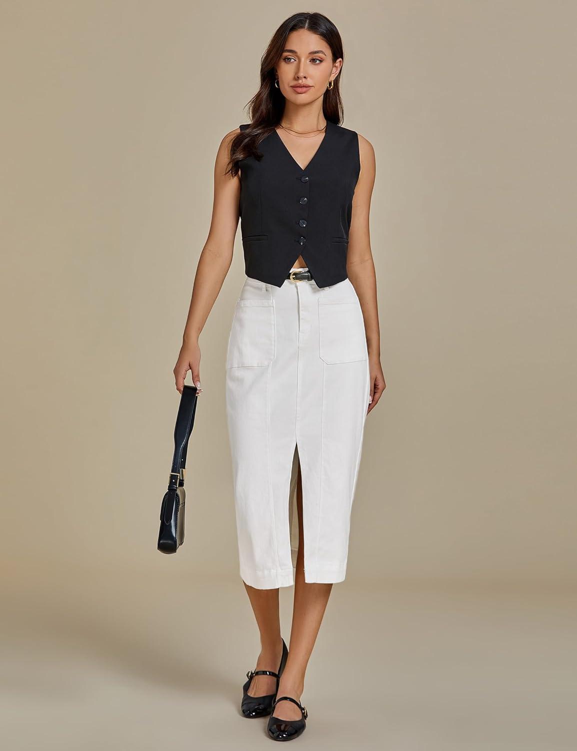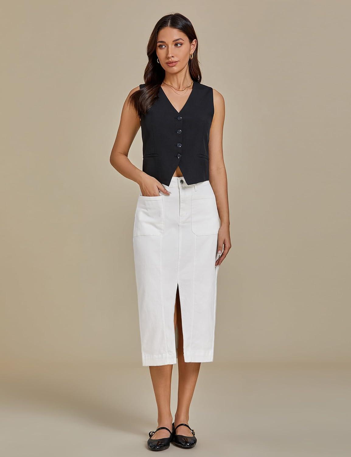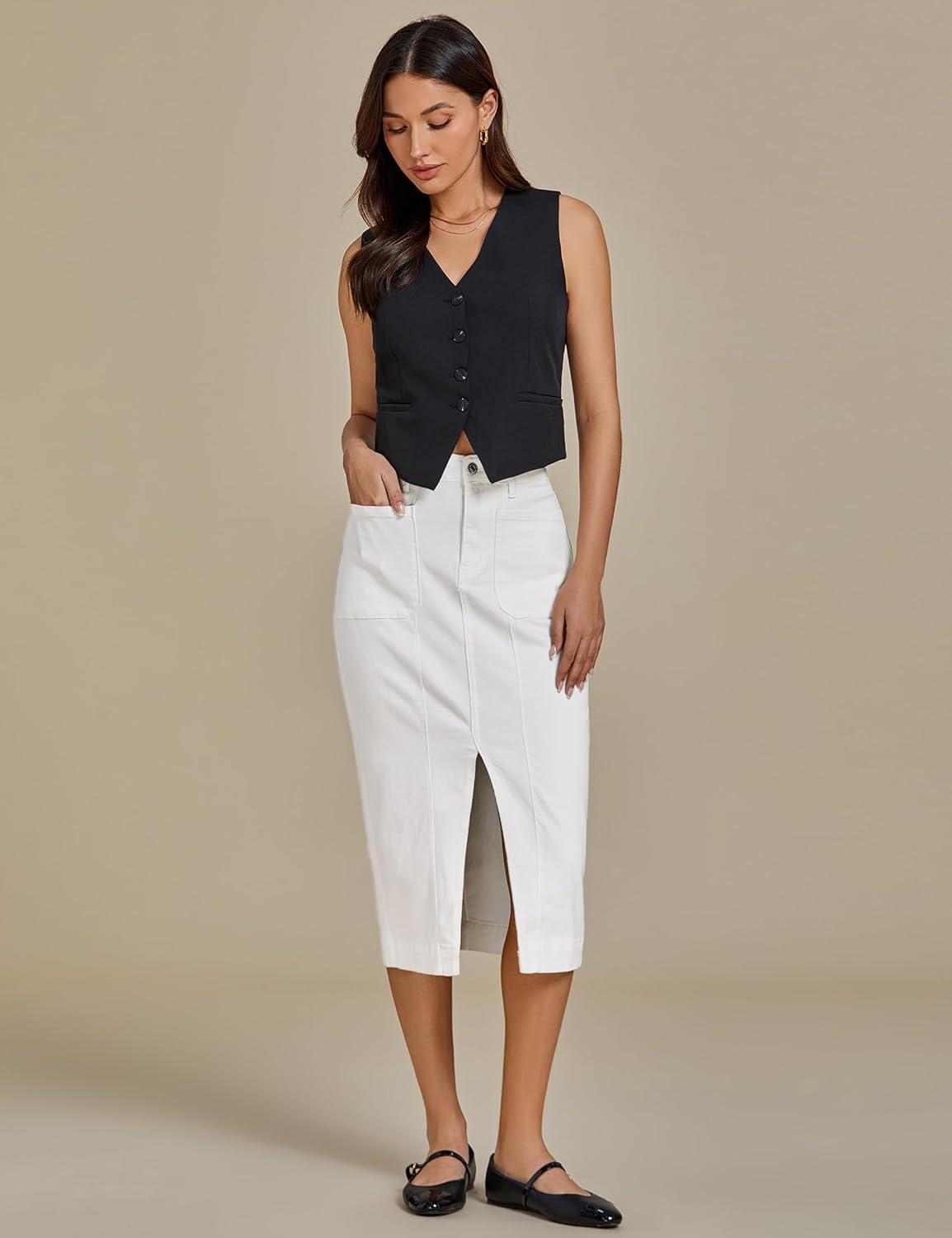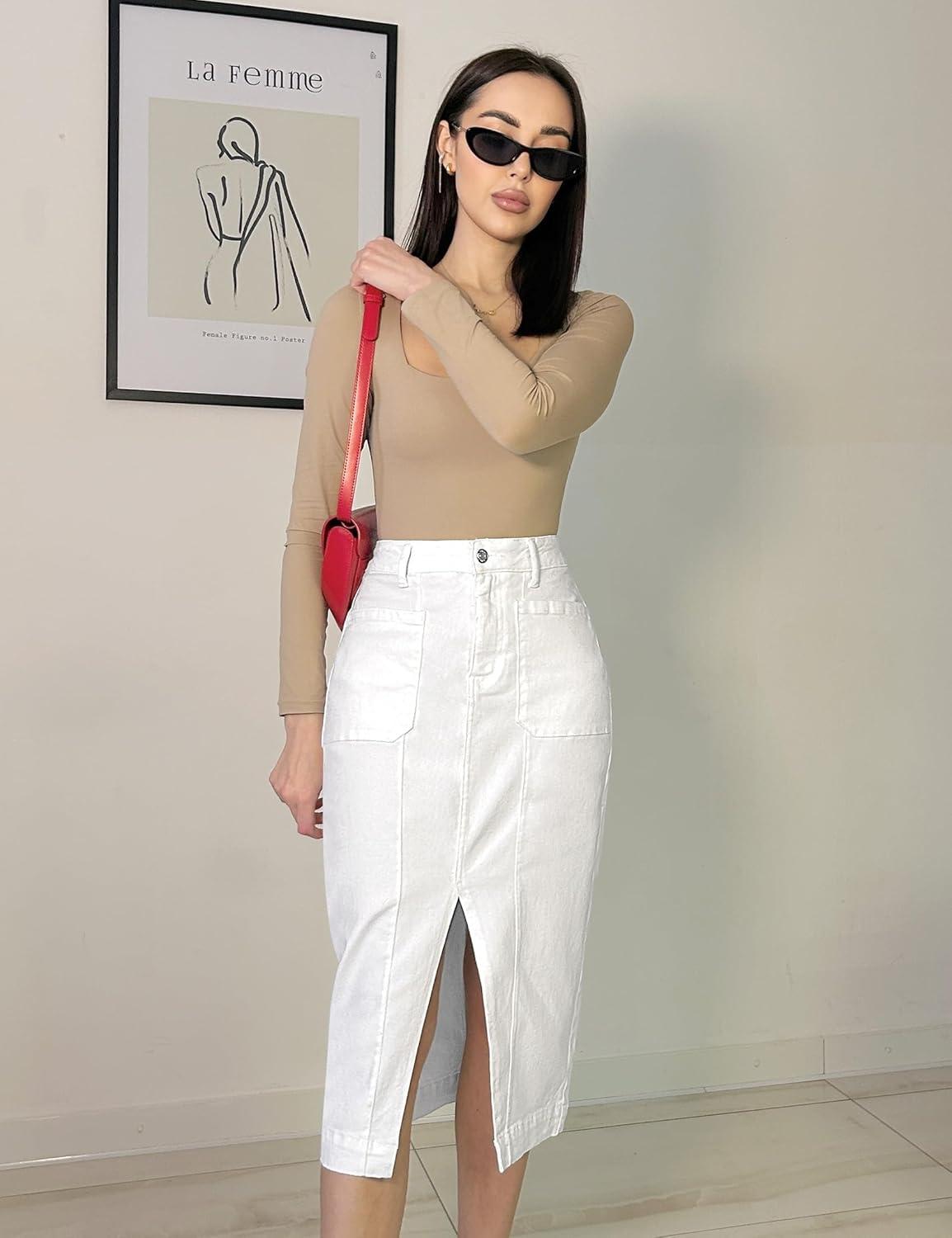 luvamia Jean Skirts for Women Denim Trendy Casual Stretchy High Waisted Midi Front Pockets Below Knee Skirt with Slit(Cream White)