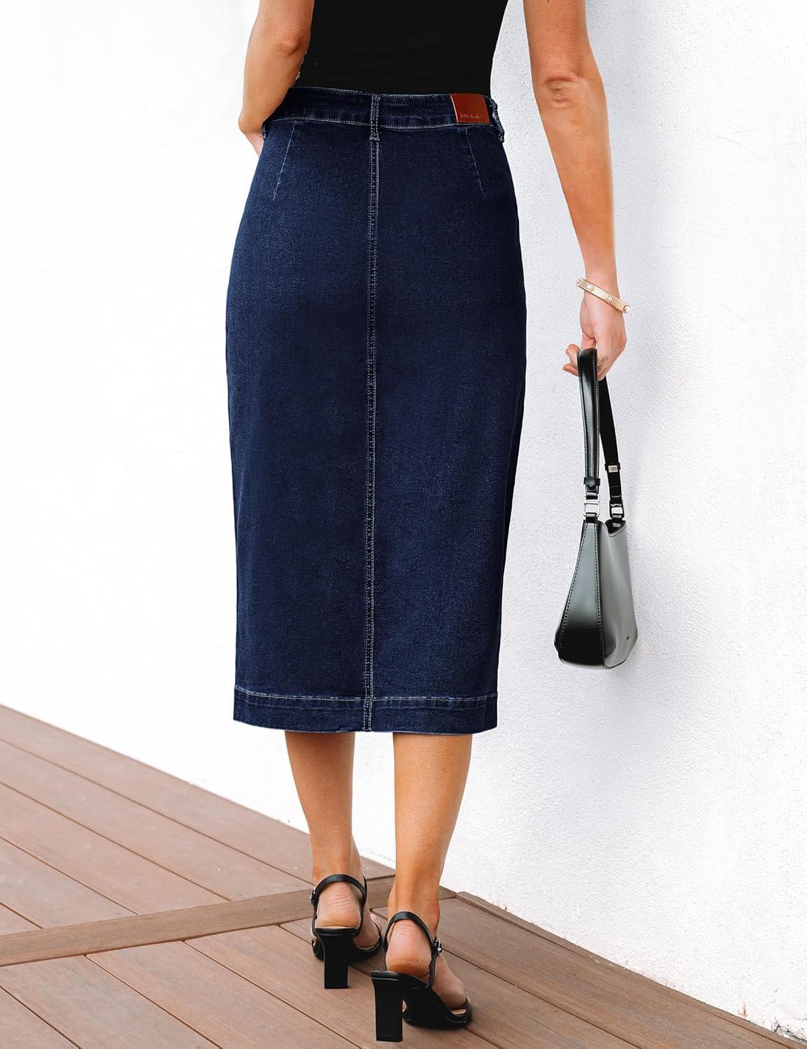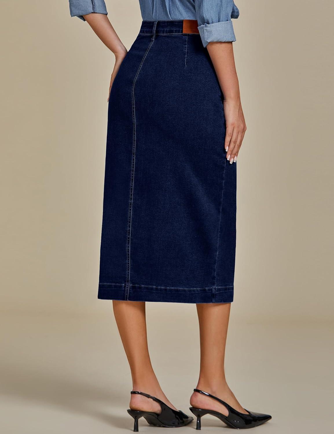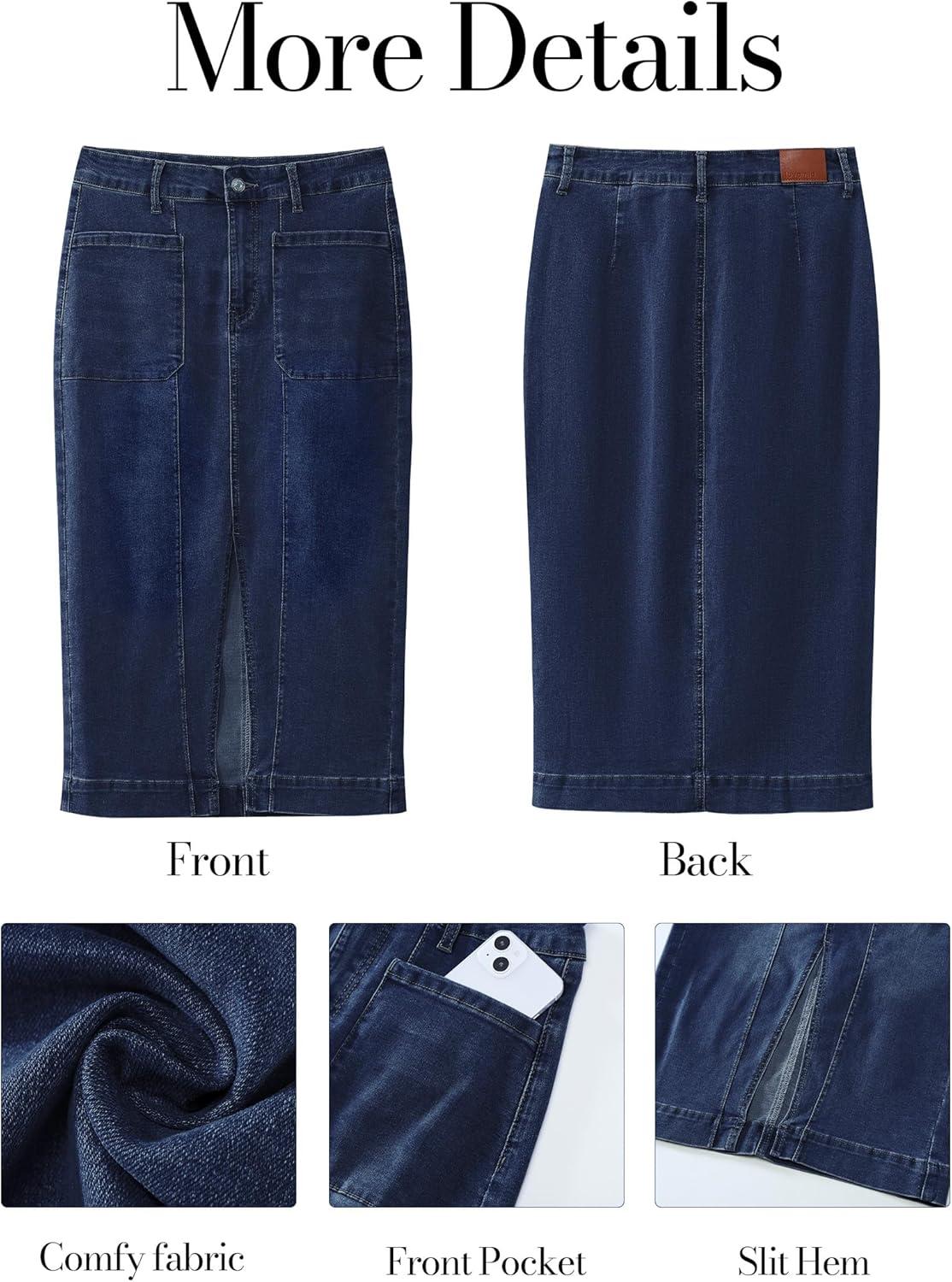 luvamia Jean Skirts for Women Denim Trendy Casual Stretchy High Waisted Midi Front Pockets Below Knee Skirt with Slit(Nightfall Blue)