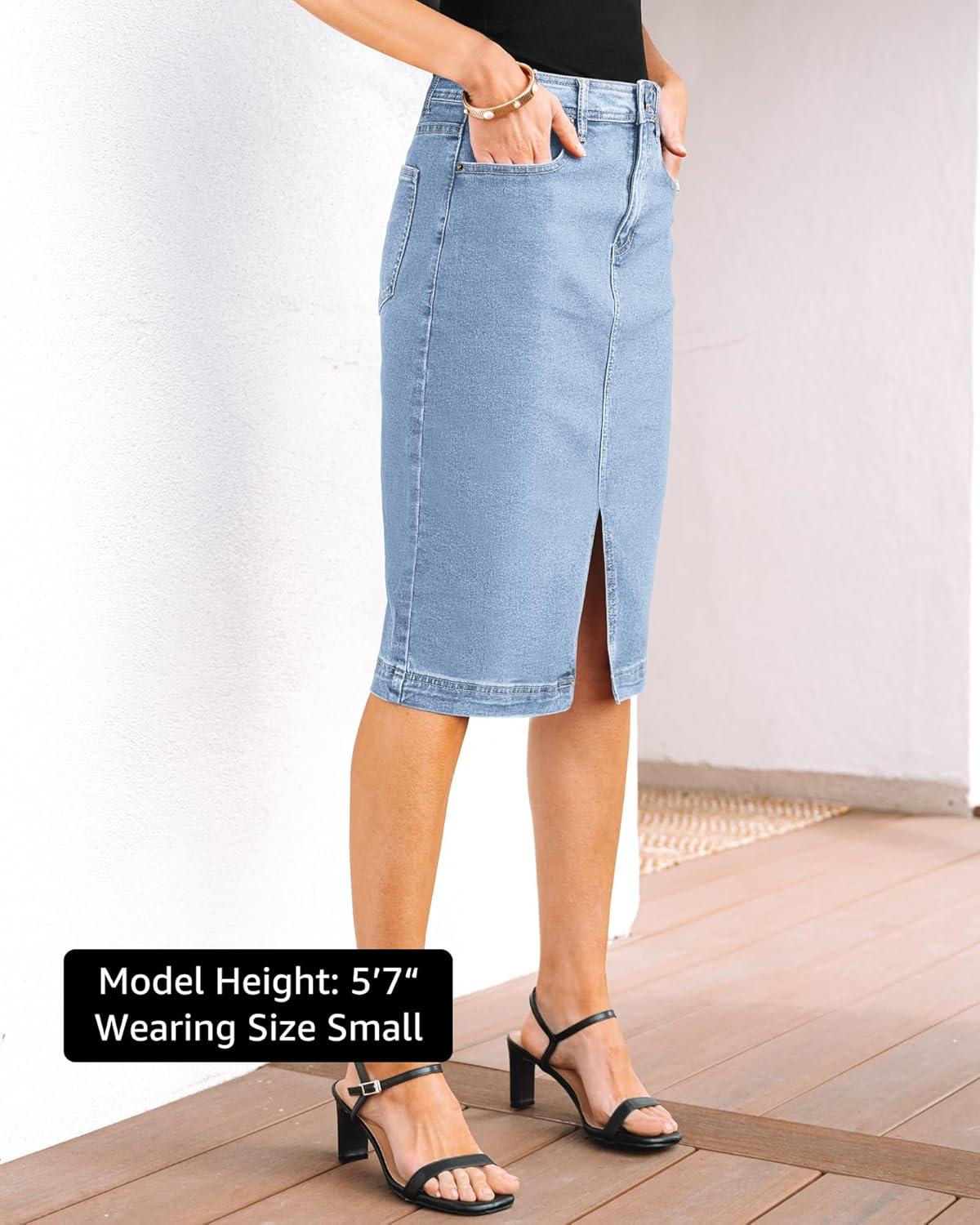 luvamia Jean Skirts for Women Denim Trendy Summer Casual Stretchy High Waisted Midi Below Knee Pencil Skirt with Slit(Cool Blue)