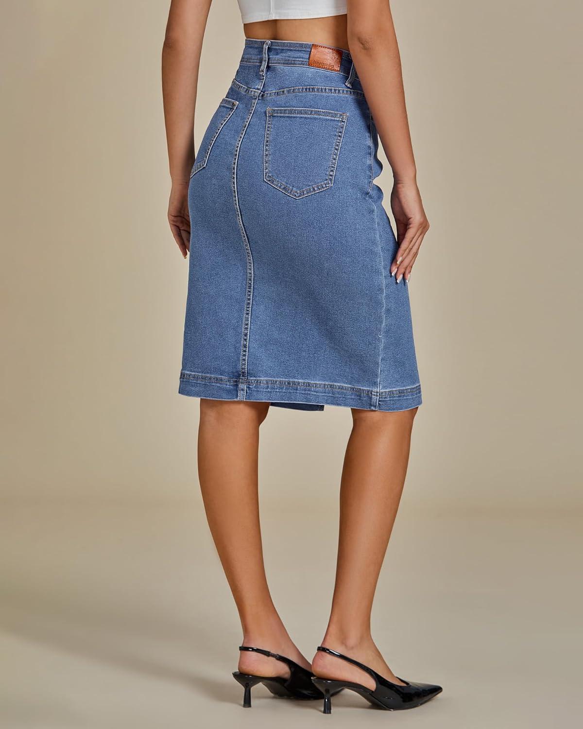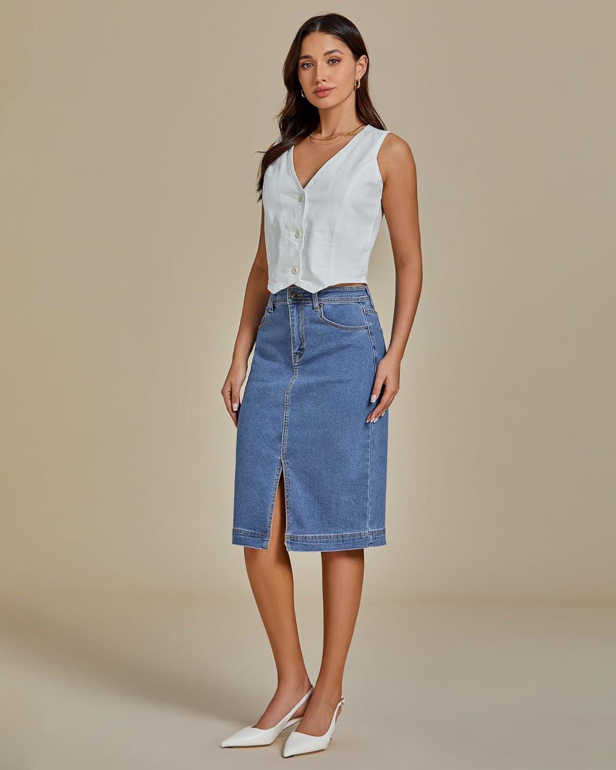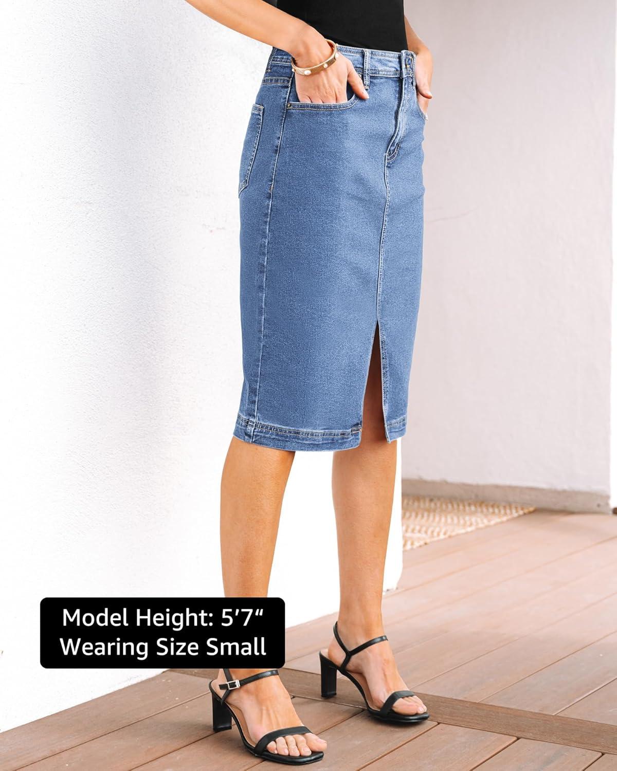 luvamia Jean Skirts for Women Denim Trendy Summer Casual Stretchy High Waisted Midi Below Knee Pencil Skirt with Slit(Medium Blue)