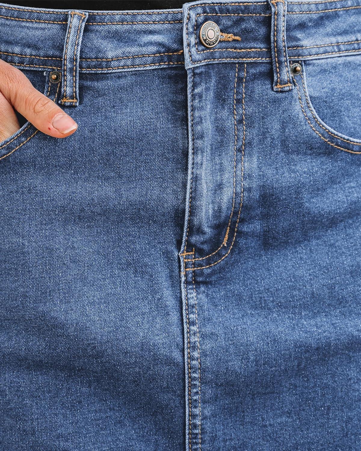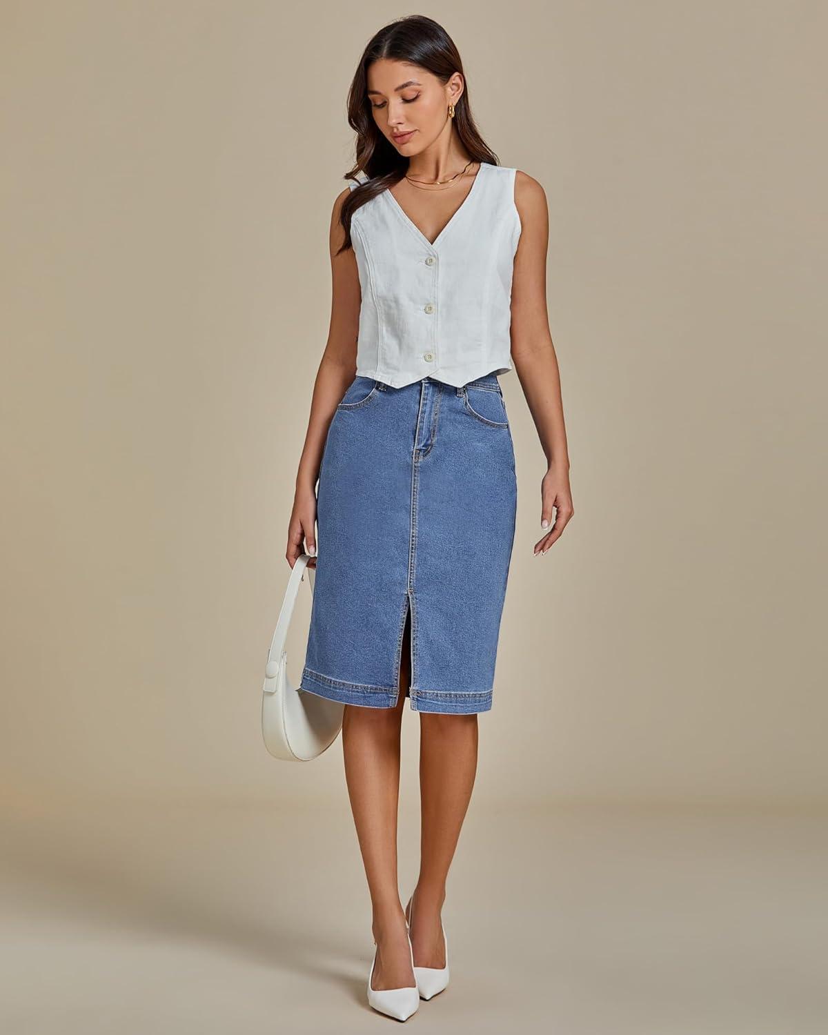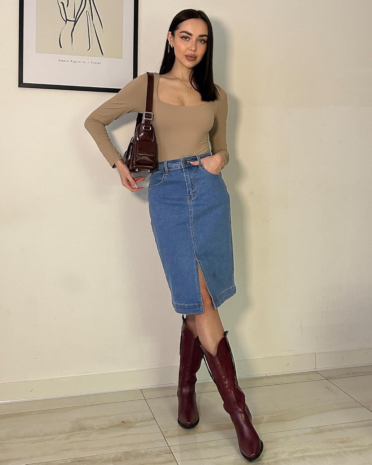 luvamia Jean Skirts for Women Denim Trendy Summer Casual Stretchy High Waisted Midi Below Knee Pencil Skirt with Slit(Medium Blue)