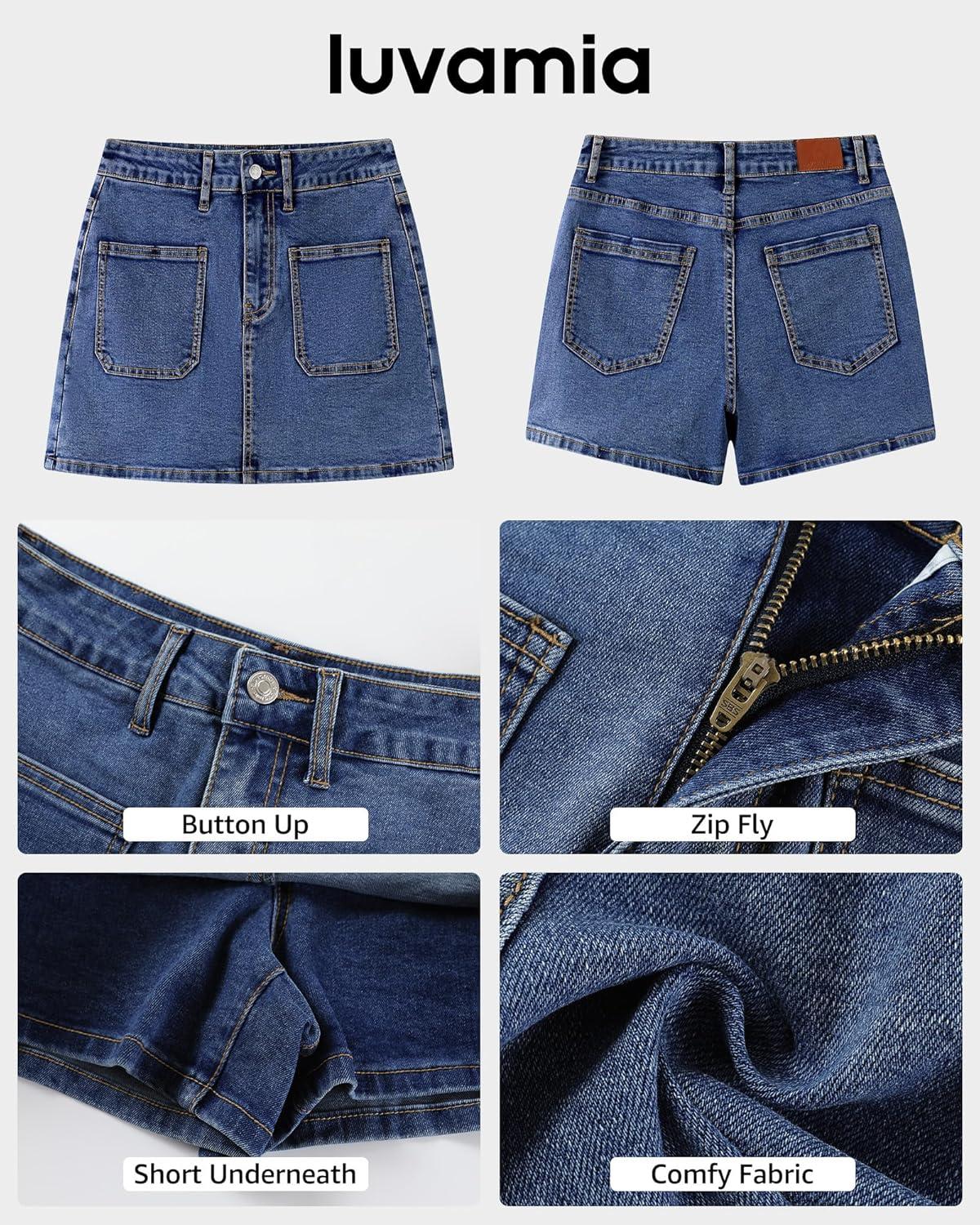 luvamia Jean Skorts for Woman Trendy High Waisted Stretchy Denim Skirt with Shorts Casual Patch Pocket Mini Skort Skirts(Bay Blue)