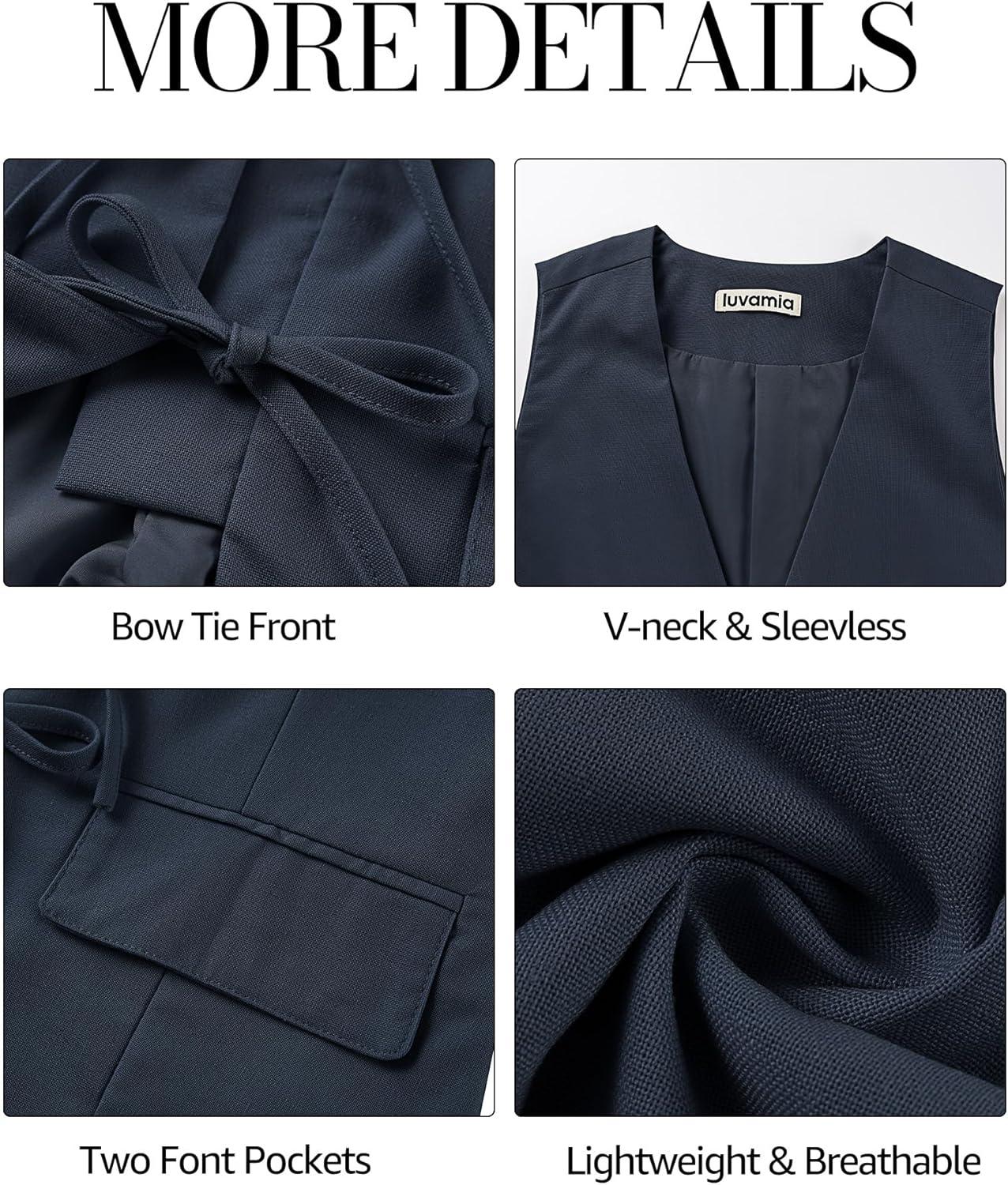 luvamia Linen Vest for Women Trendy Sleeveless Tie Front Tops Summer Casual Top Waistcoat Suit Vests with Pockets(Dark Blue)