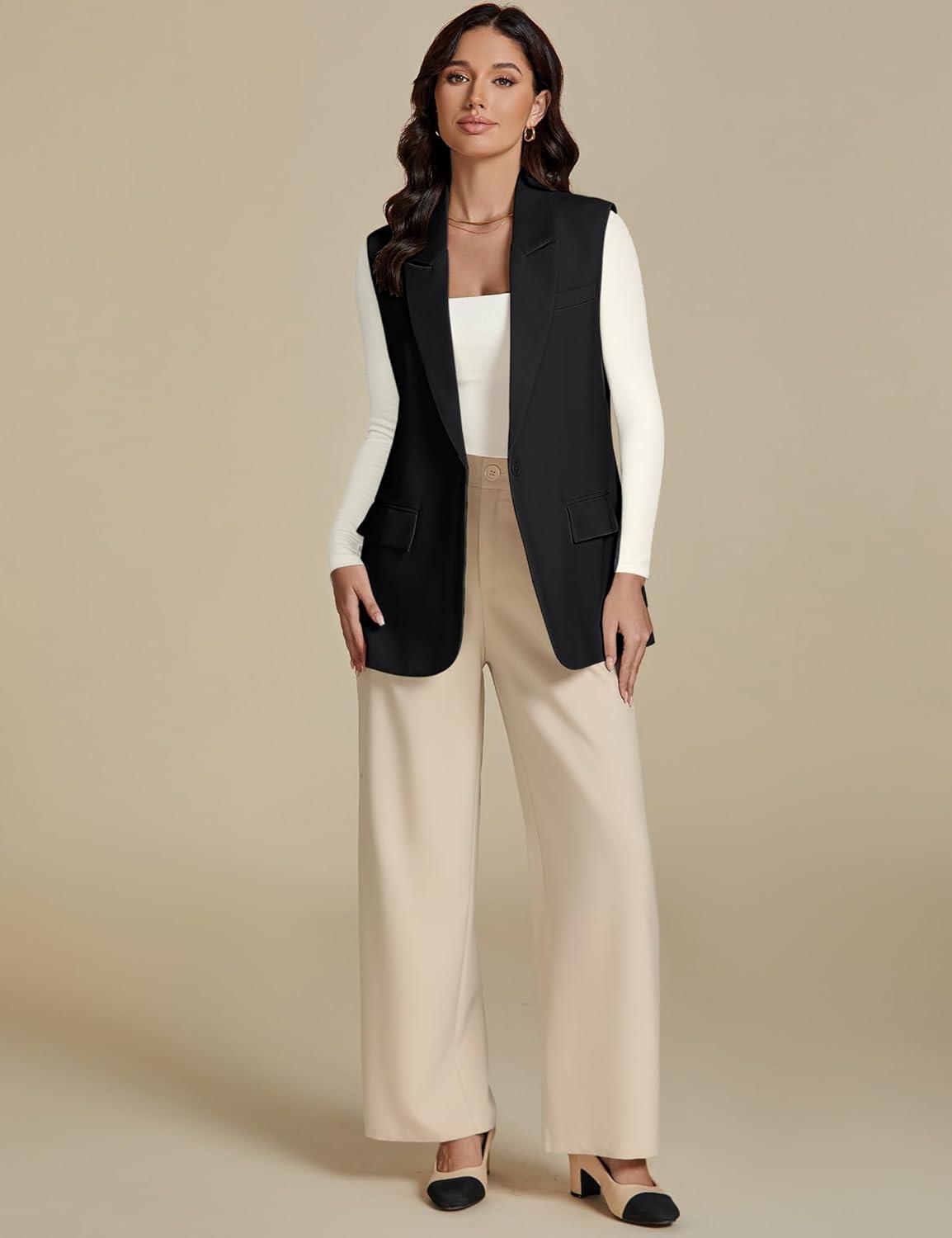 imageluvamia Long Vest for Women 2025 Spring Business Casual Sleeveless Open Front Blazers Suit Vests Top Pockets Work OfficeBlack