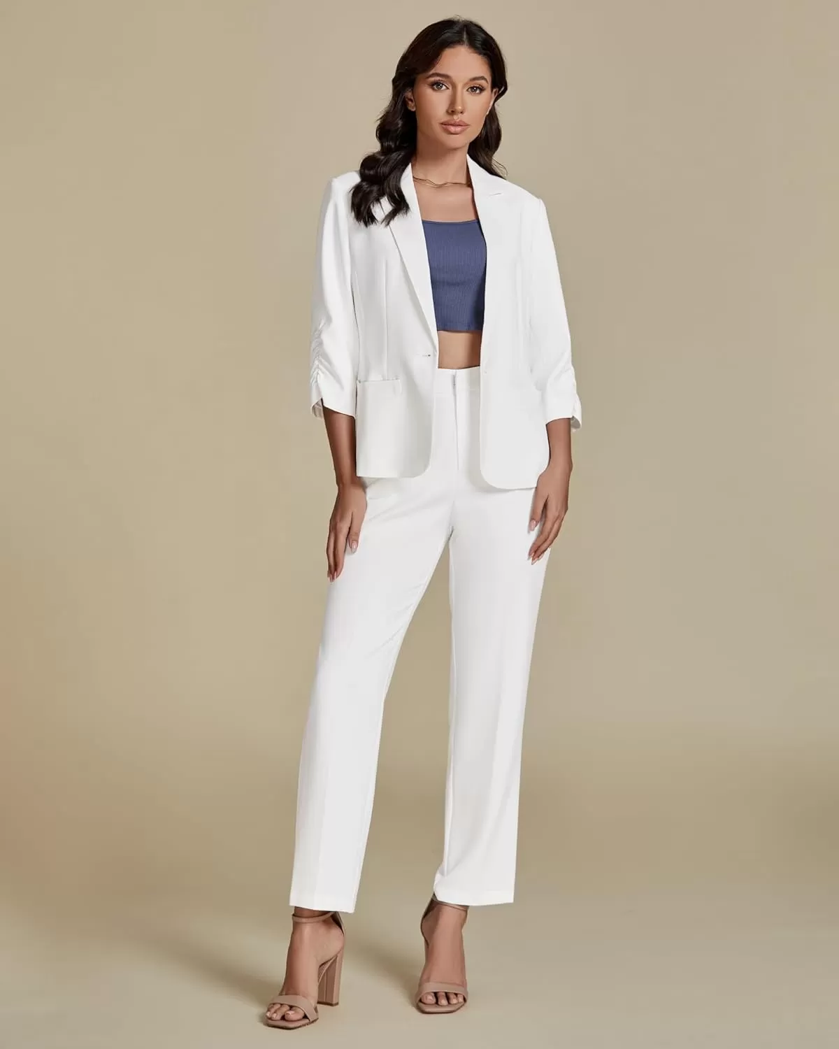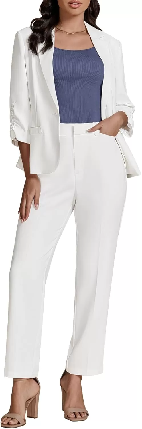 imageluvamia Pant Suits for Women Dressy 2 Piece Business Casual Outfits 34 Sleeve Blazer Straight Leg Pant Sets Office WorkCream White