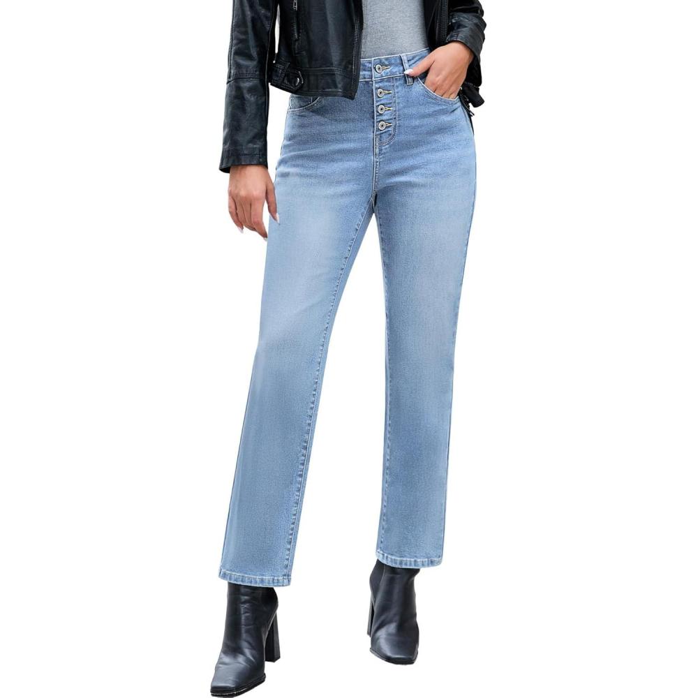 luvamia Straight Leg Jeans for Women High Waisted Trendy Button Fly Trouser Jeans Stretchy Denim Pants with Pockets(Medium Blue)
