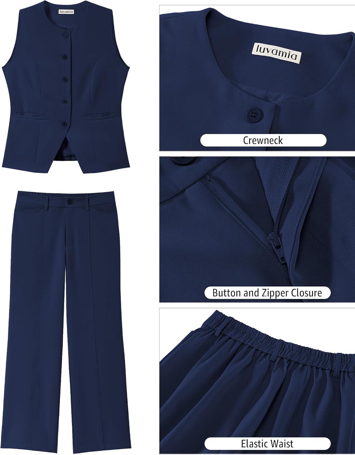 Get up to 70% off on luvamia Vest Pants Suits for Women Dressy 2 Piece Business Casual Outfits Sleeveless Blazer Wide Leg Pants Pantsuit Sets(Navy Blue) styles during our end-of-season clearance event.