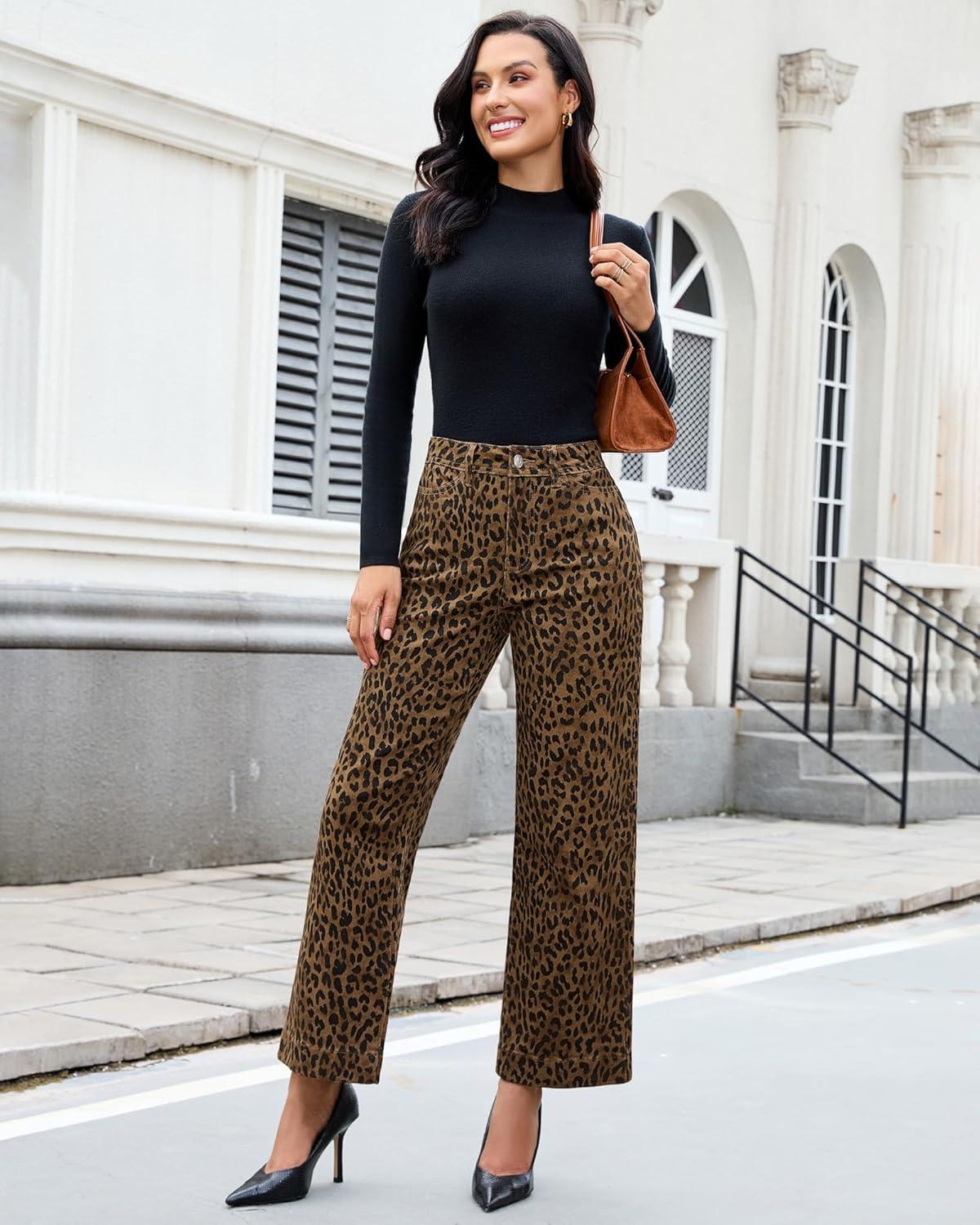 luvamia Wide Leg Jeans Woman Trendy High Waisted Leopard Cheetah Print Ankle Length Stretchy Denim Pants with Pockets(Mini Brown Leopard)