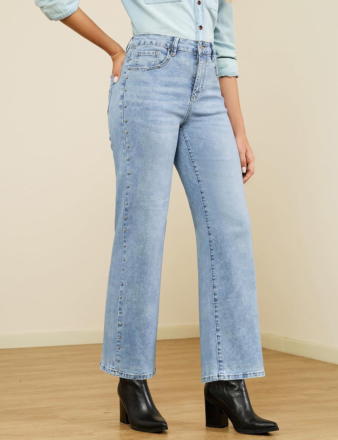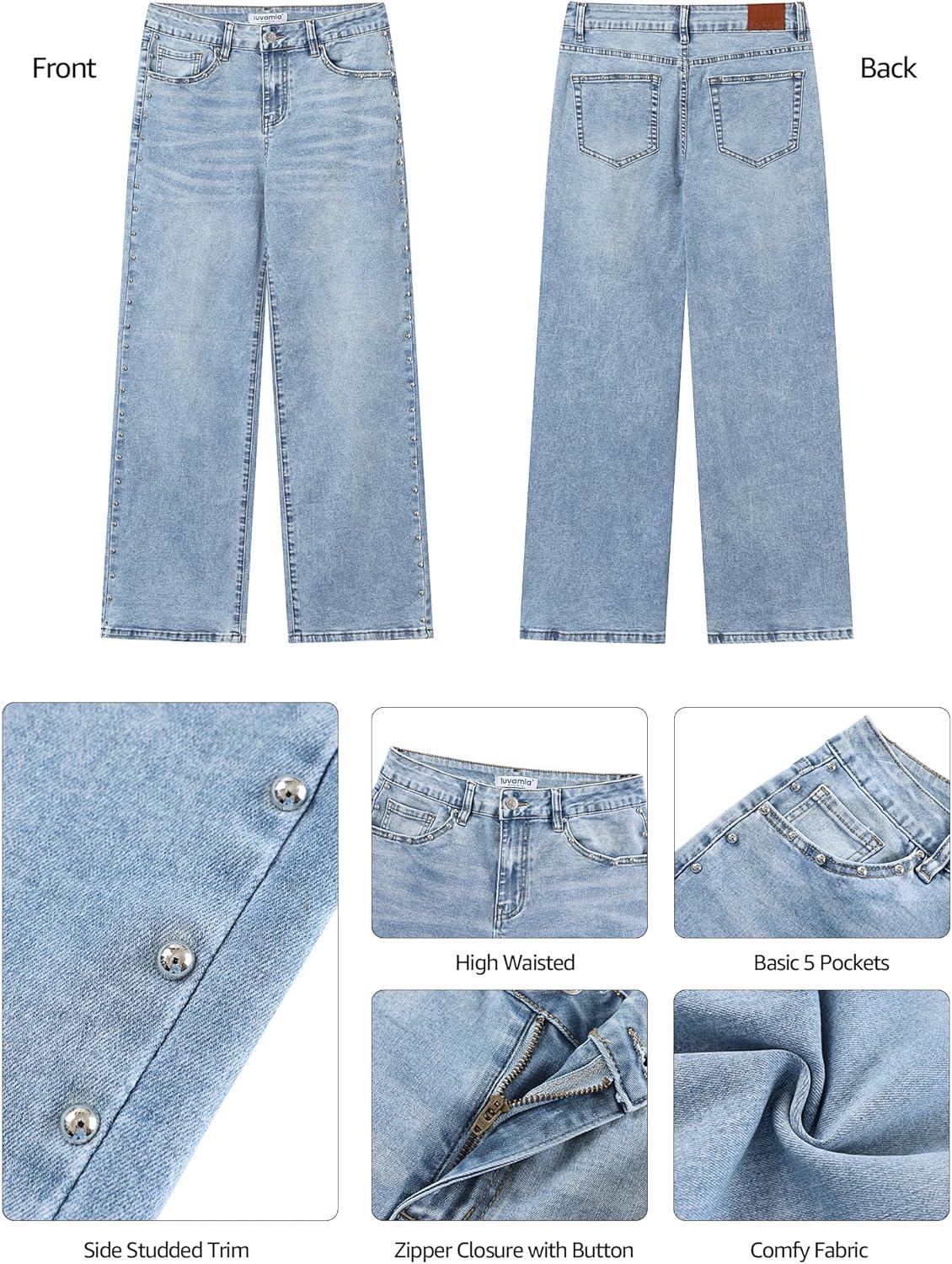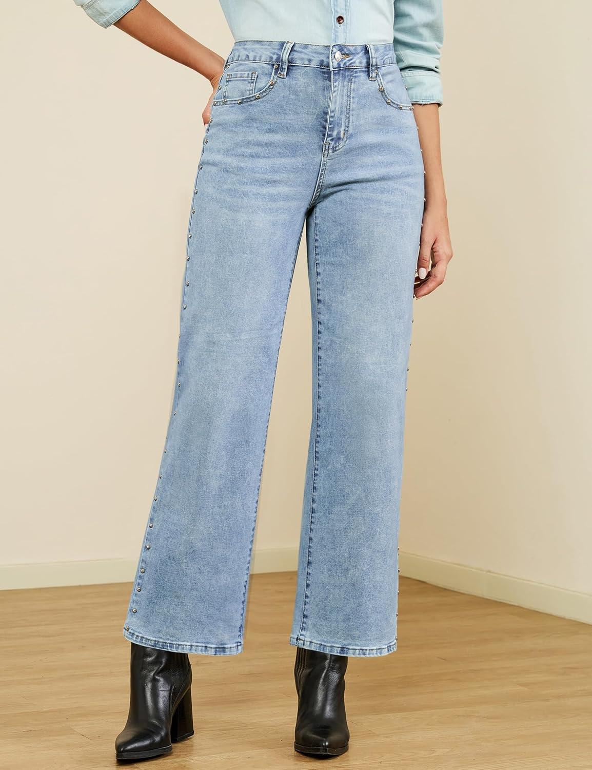 luvamia Women Jeans Wide Leg High Waisted Trendy Side Studded Embellished Distressed Stretchy Denim Pants Party Jeans(Bay Blue)