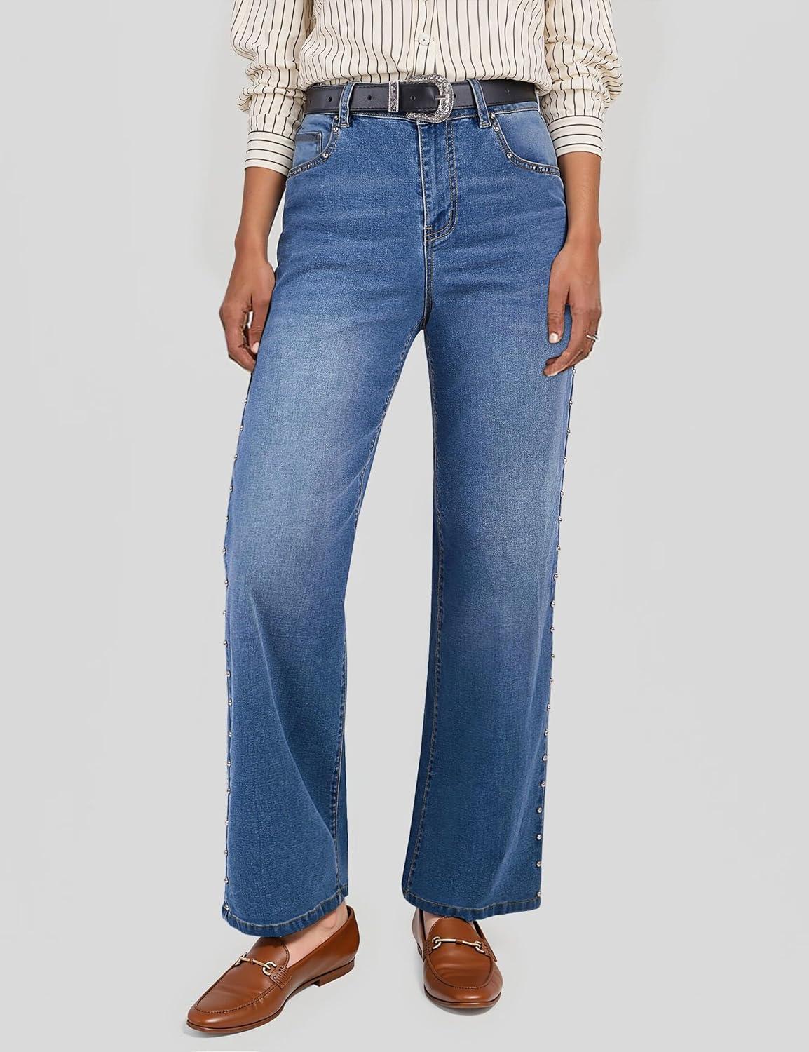 imageluvamia Women Jeans Wide Leg High Waisted Trendy Side Studded Embellished Distressed Stretchy Denim Pants Party JeansClassic Blue