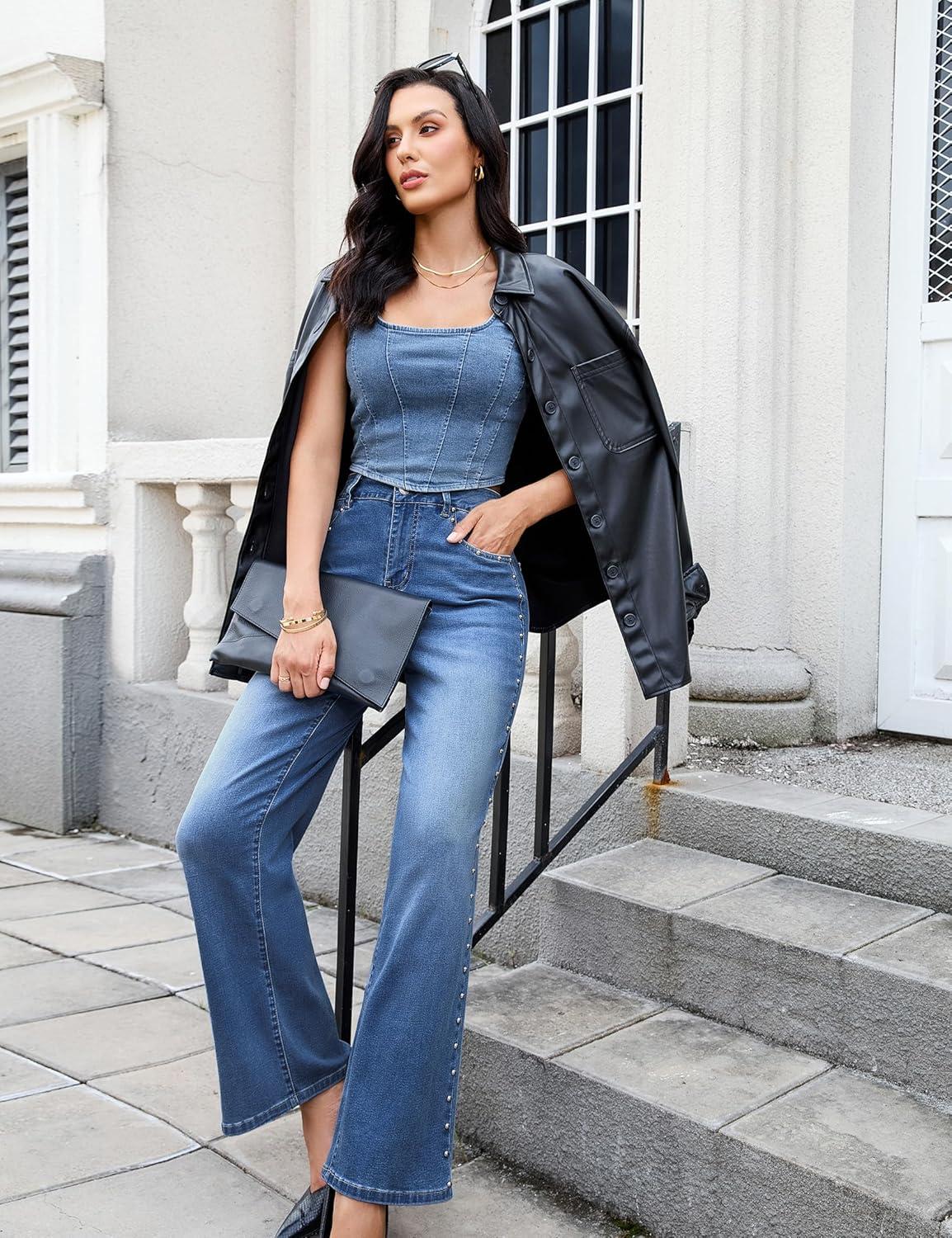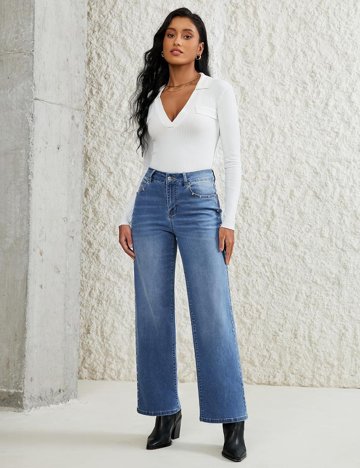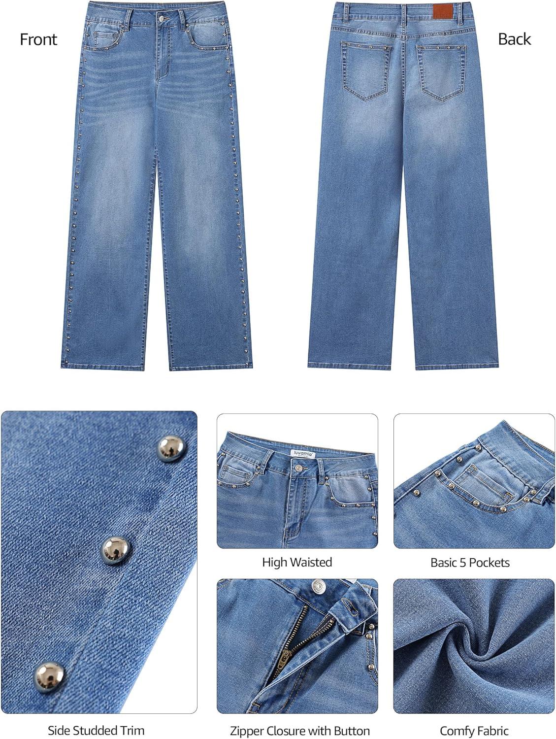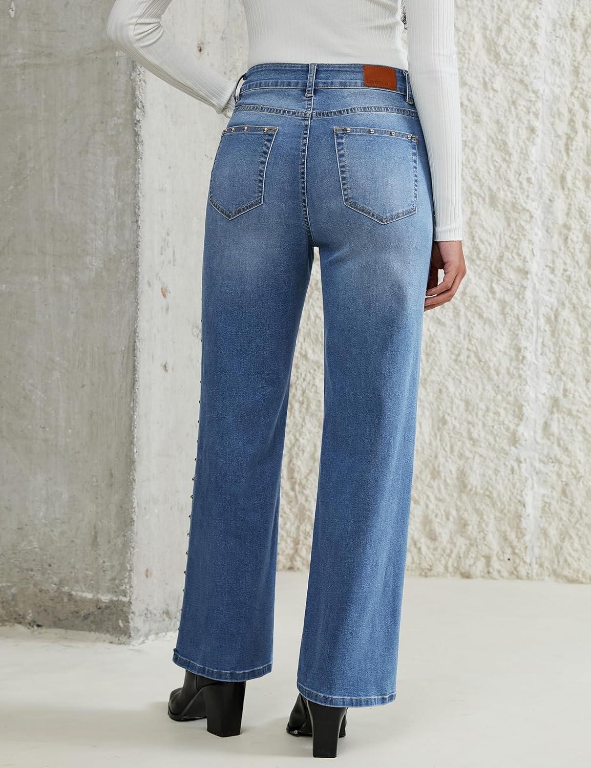 luvamia Women Jeans Wide Leg High Waisted Trendy Side Studded Embellished Distressed Stretchy Denim Pants Party Jeans(Classic Blue)