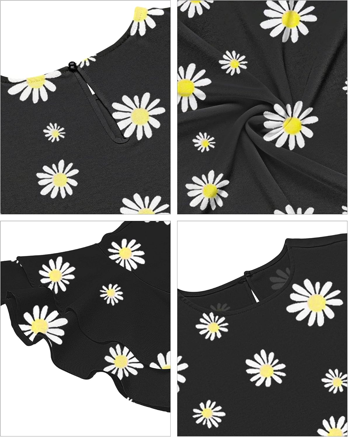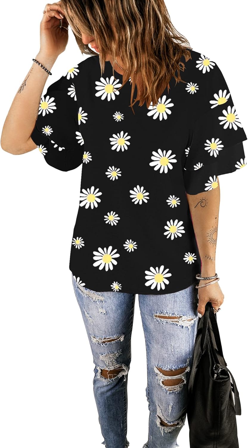 luvamia Women's Casual 3/4 Tiered Bell Sleeve Crewneck Loose Tops Blouses Shirt(A2 Daisy Floral Black)
