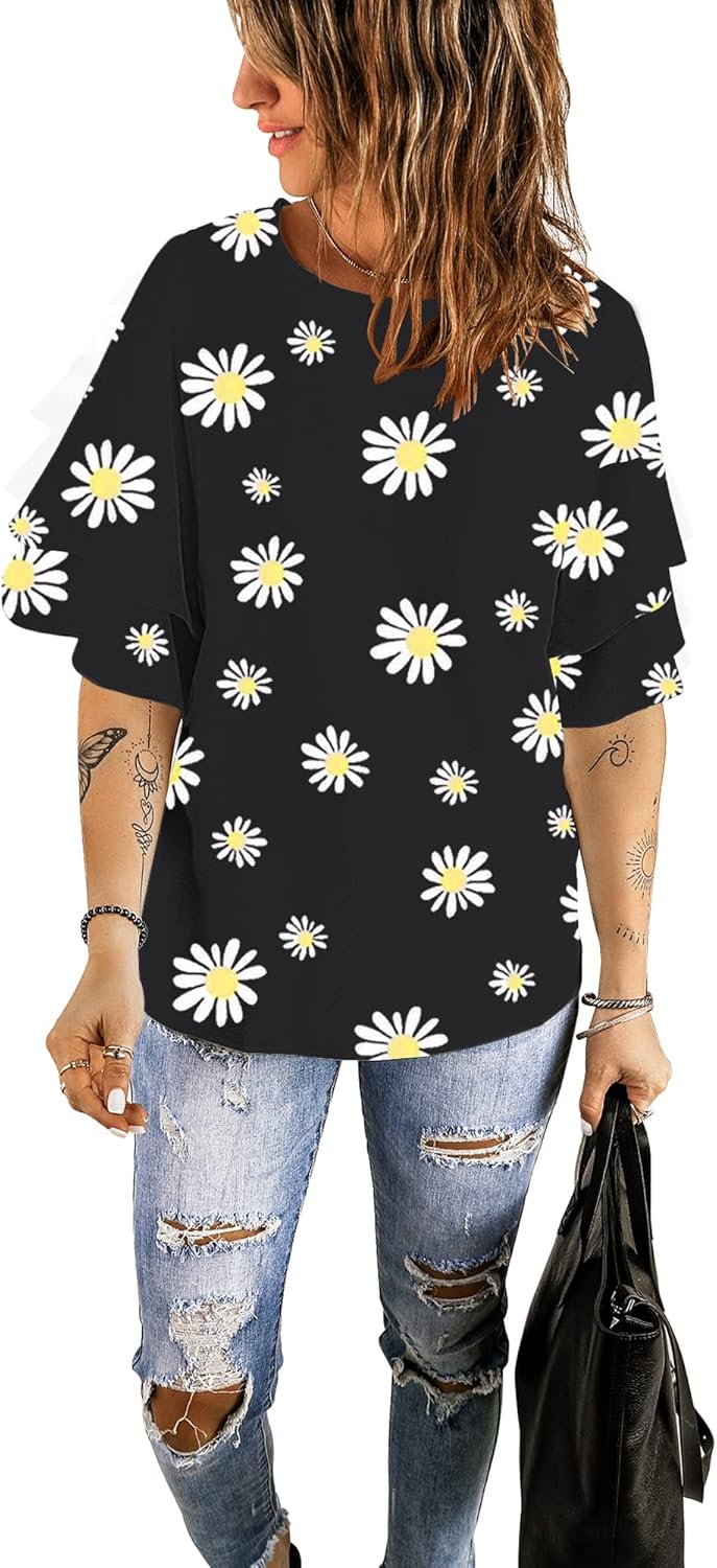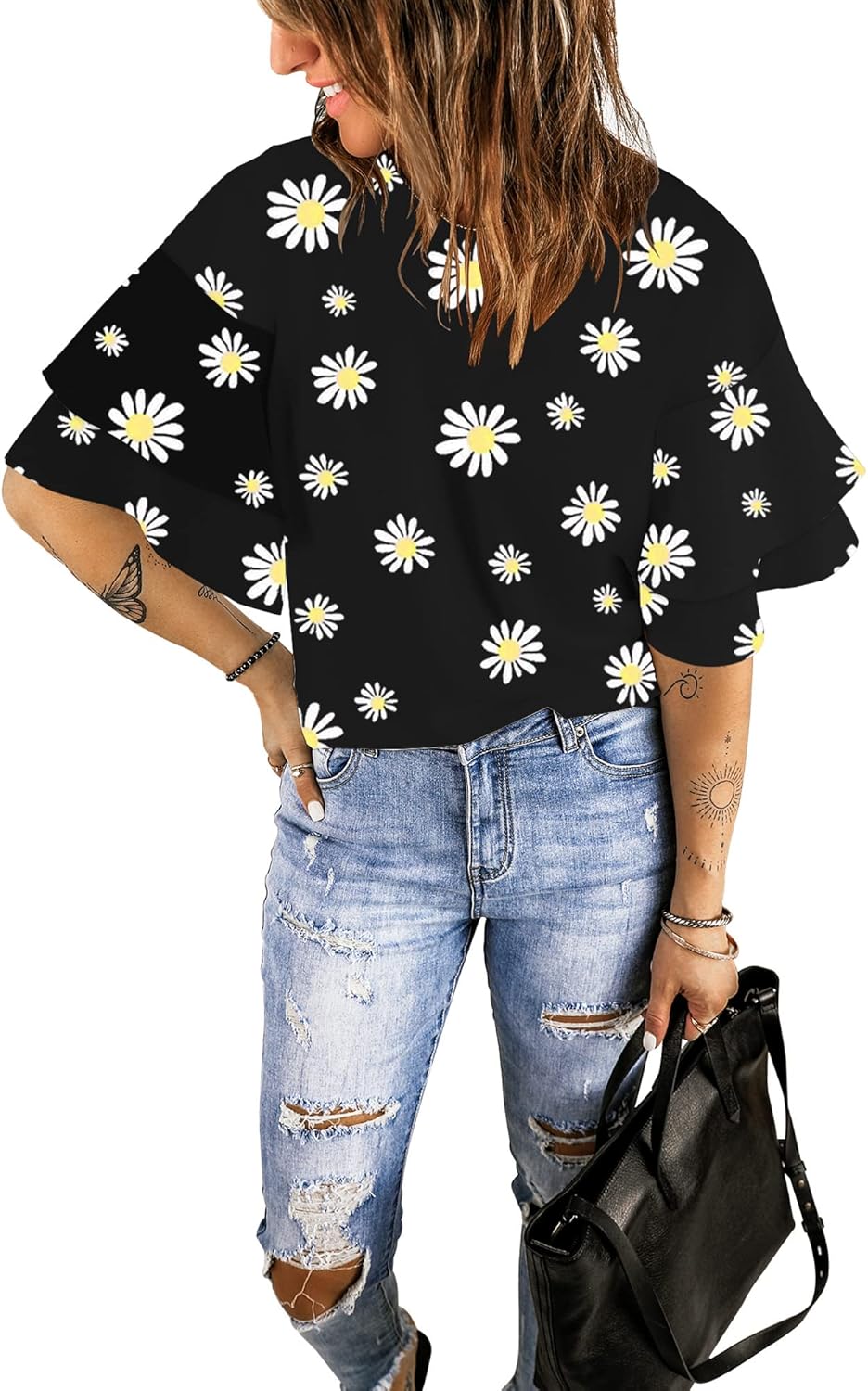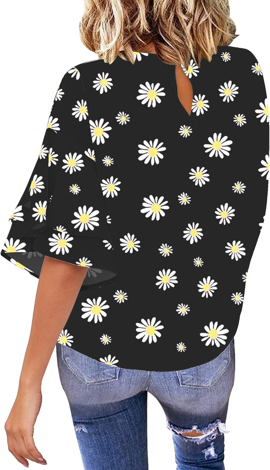 luvamia Women’s Casual 3/4 Tiered Bell Sleeve Crewneck Loose Tops Blouses Shirt(A2 Daisy Floral Black)