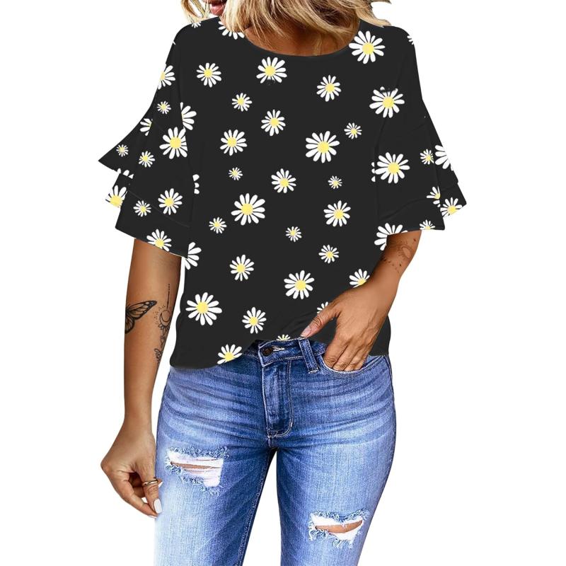 luvamia Womens Casual 34 Tiered Bell Sleeve Crewneck Loose Tops Blouses ShirtA2 Daisy Floral Black