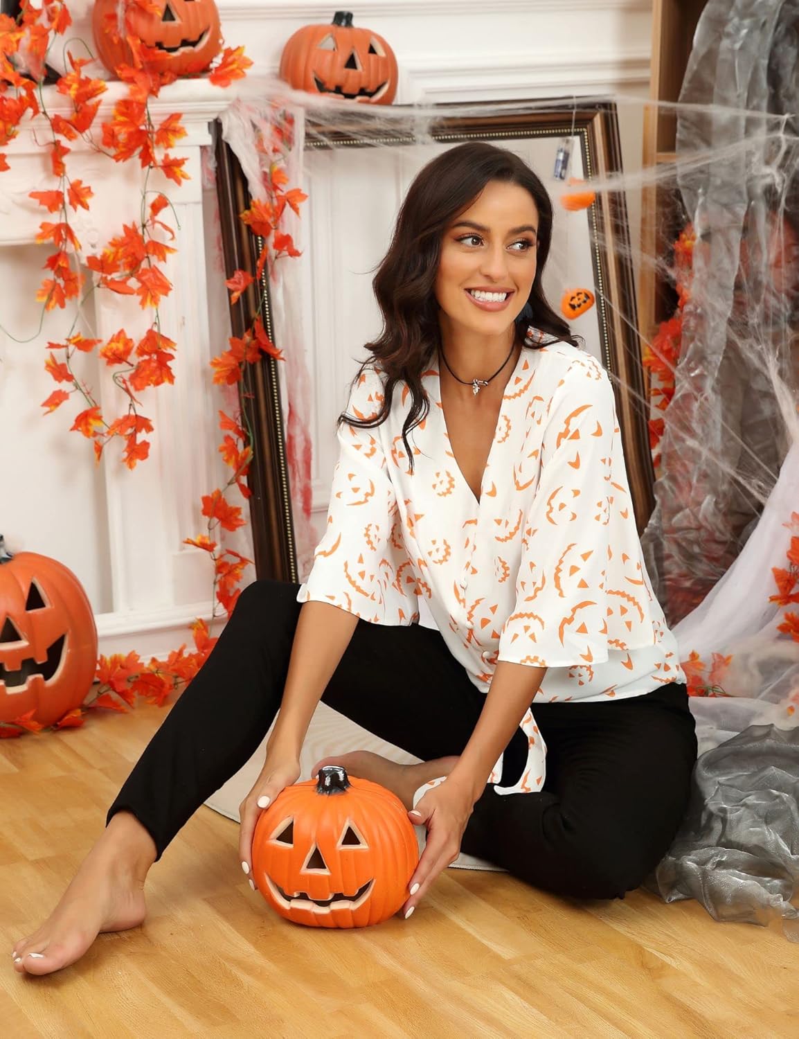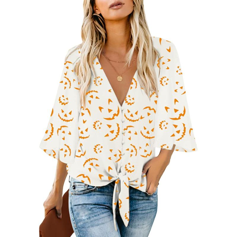 luvamia Women's Casual V Neck Tops 3/4 Sleeve Tie Knot Blouses Solid Button Down Shirts(Halloween-party Shirts)